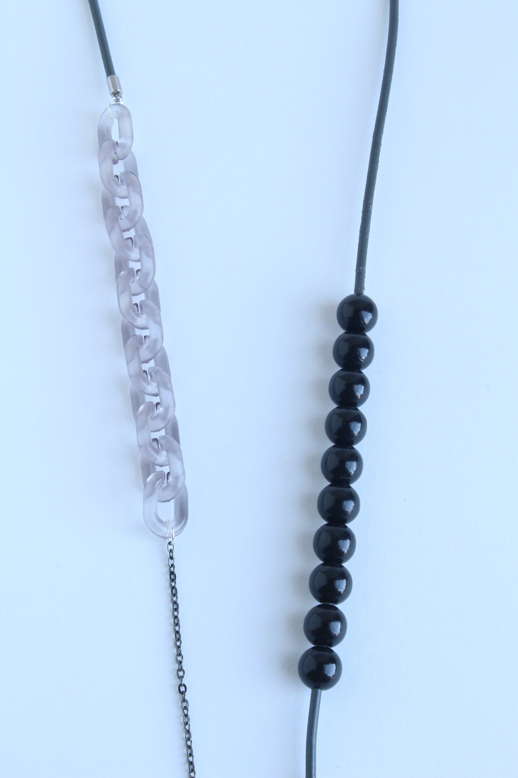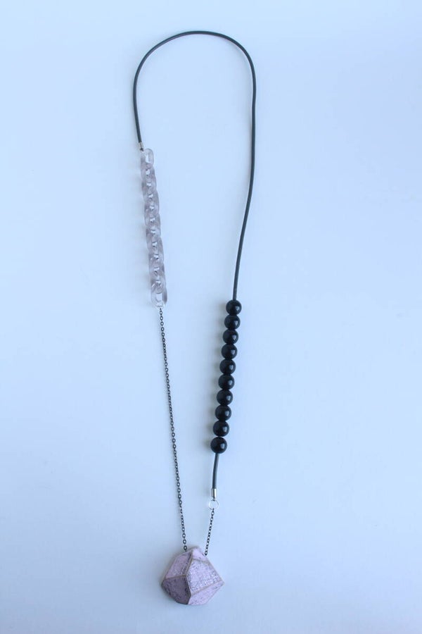 Hanger van geverfd beukenhout aan een ketting van metaal, acrylaat schakels, beukenhouten kralen en leerkoordHanger: ± 4 cm x 4 cm Ketting: lengte ±90 cm