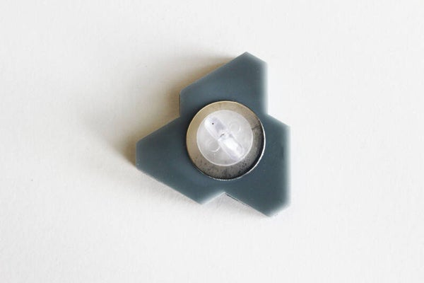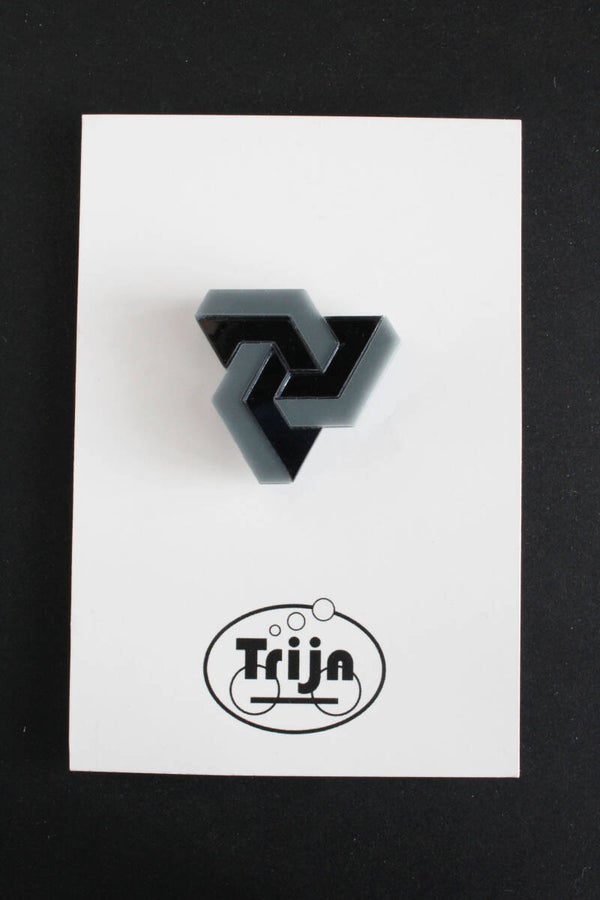 Broche "Schuivende figuur" van glanzend en spiegel grijs acrylaat.
