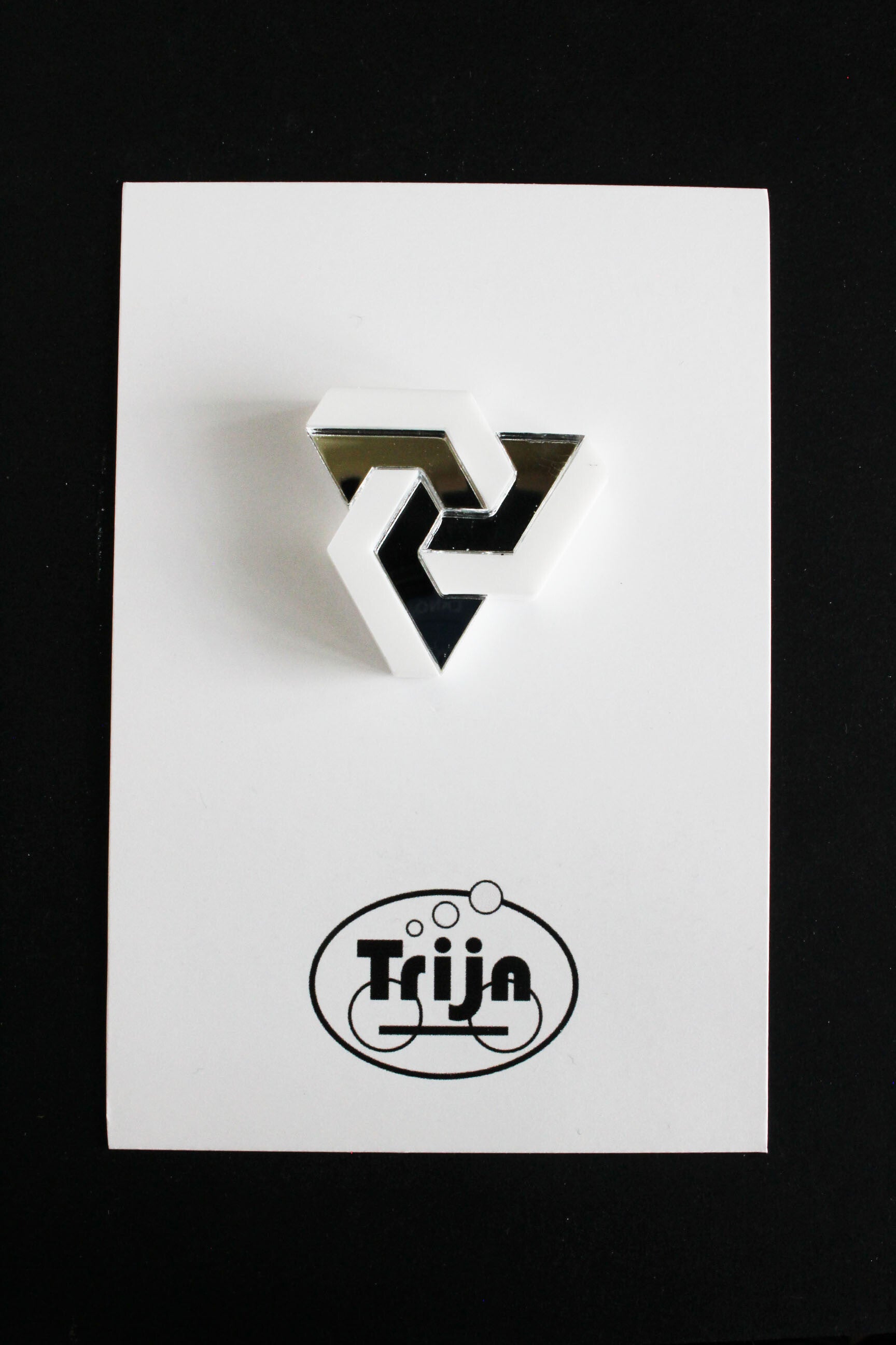 Broche "Schuivende figuur" van glanzend wit en spiegel acrylaat.