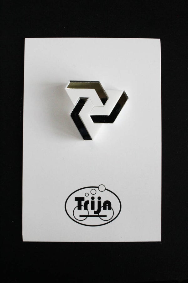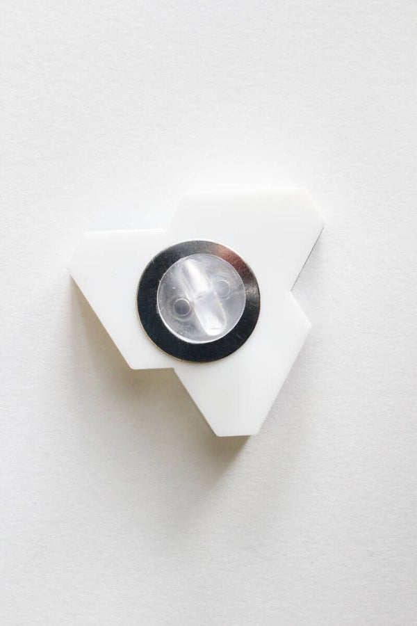 Broche "Schuivende figuur" van spiegel en glanzend wit acrylaat.