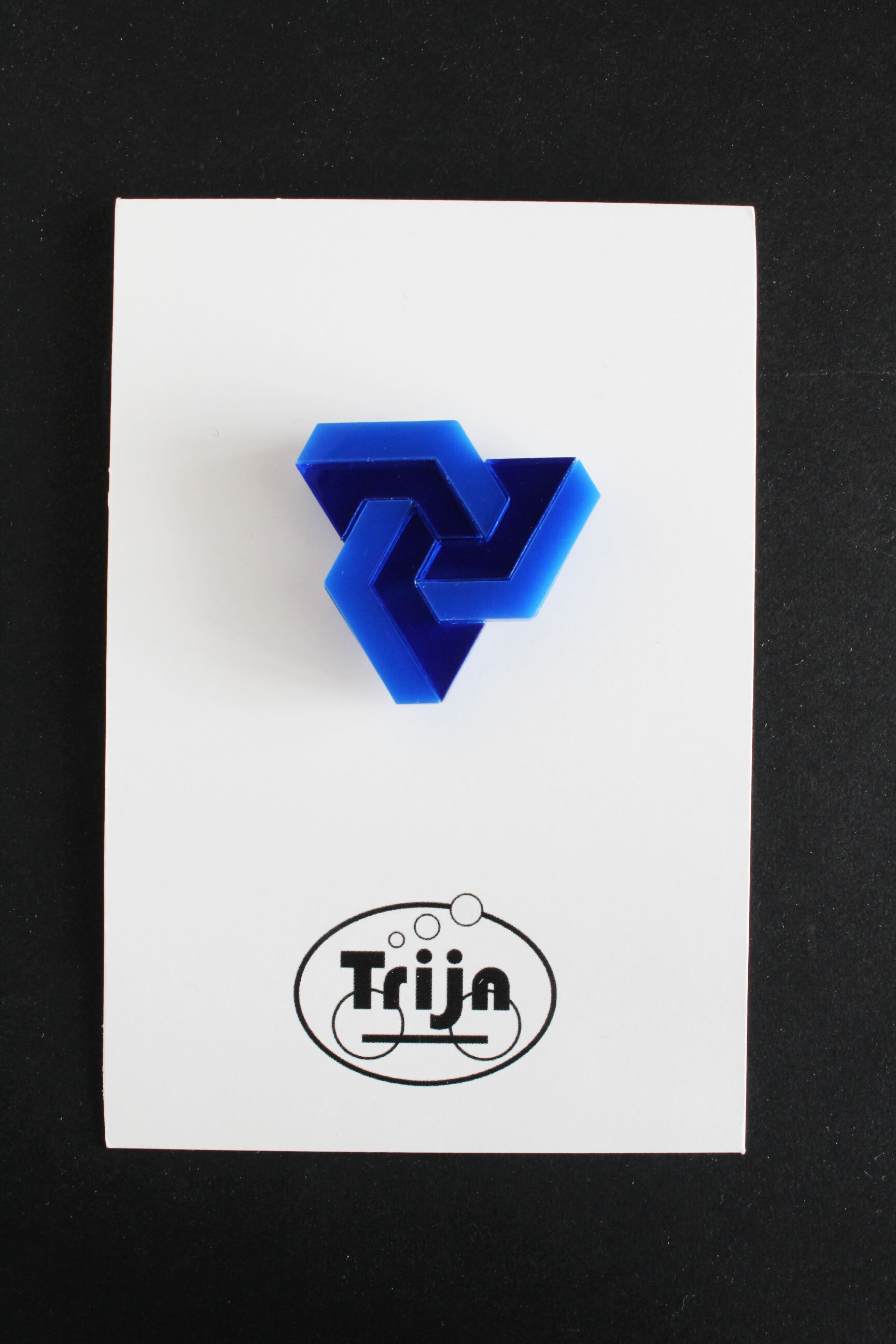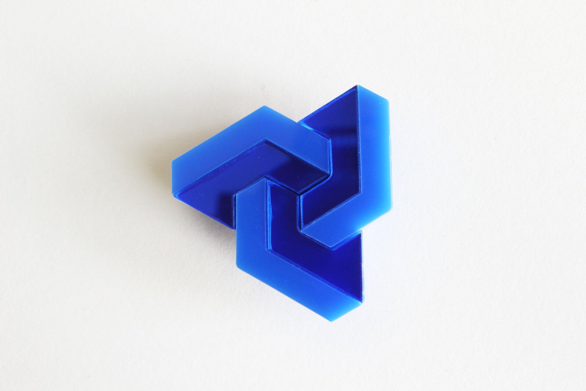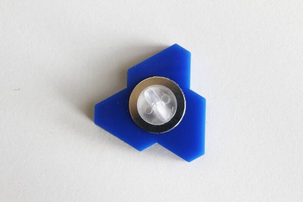 Broche "Schuivende figuur" van glanzend blauw en spiegel blauw acrylaat.