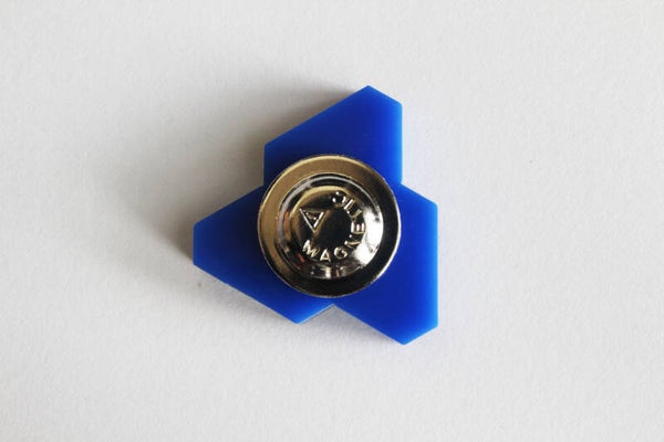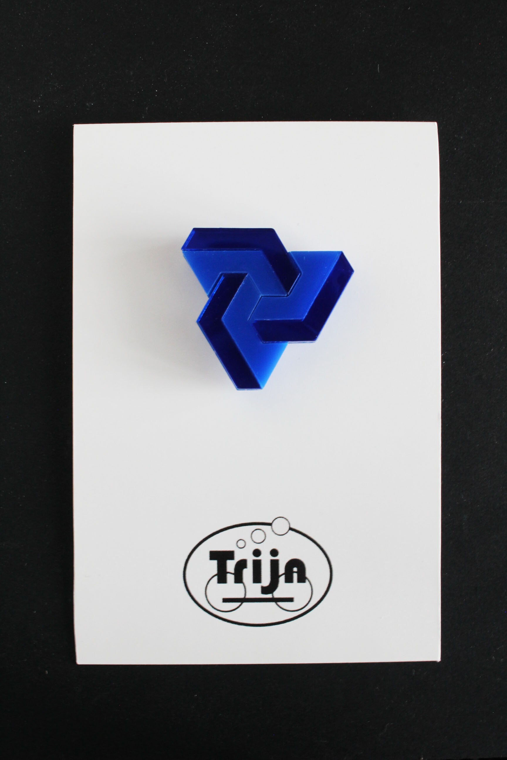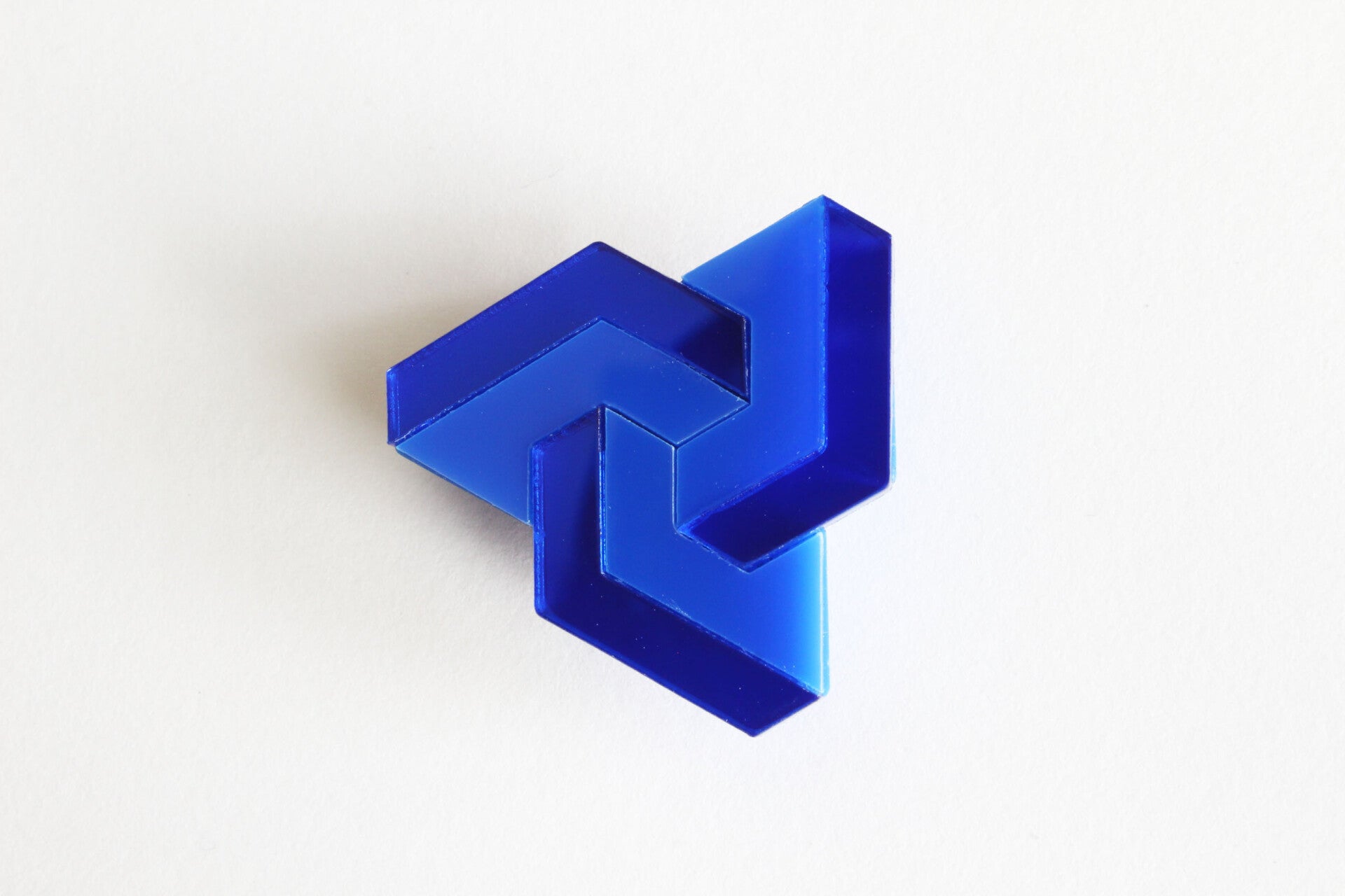 Broche "Schuivende figuur" van spiegel blauw en glanzend blauw acrylaat.