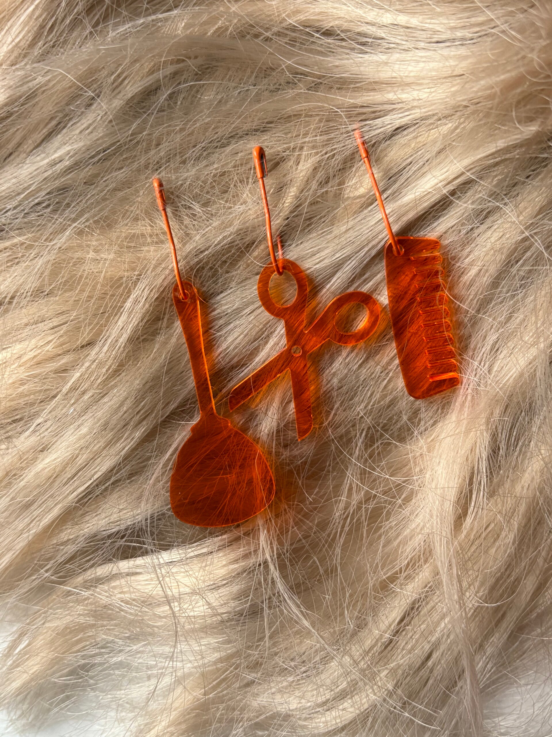 Serie van 3 speldjes "Kapper" in transparant oranje acrylaat.