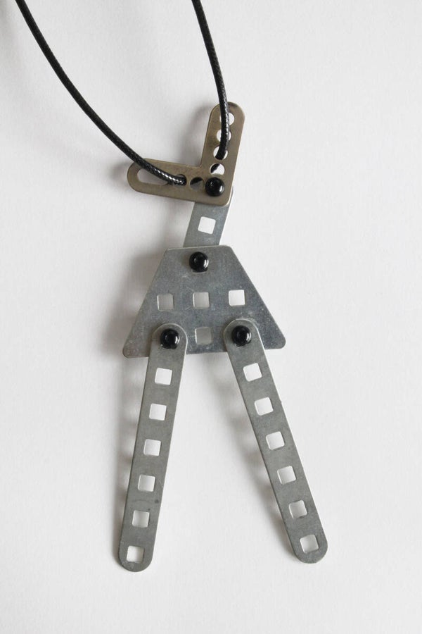 Ketting van geupcycled metaal aan een gewaxt koord. De verschillende onderdelen kunnen bewegen.