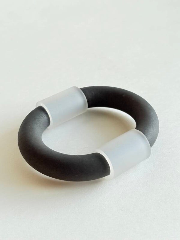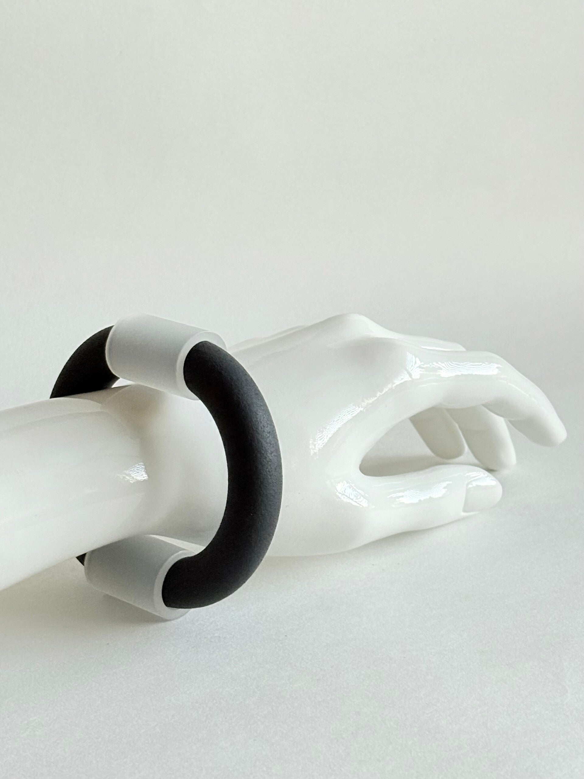 Armband van lichtgewicht neopreen rubber en mat opaal acrylaat. De armband is buig- en rekbaar zodat hij gemakkelijk over de hand past.