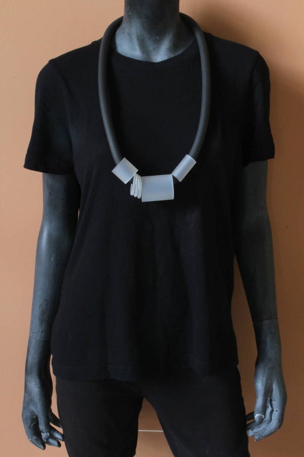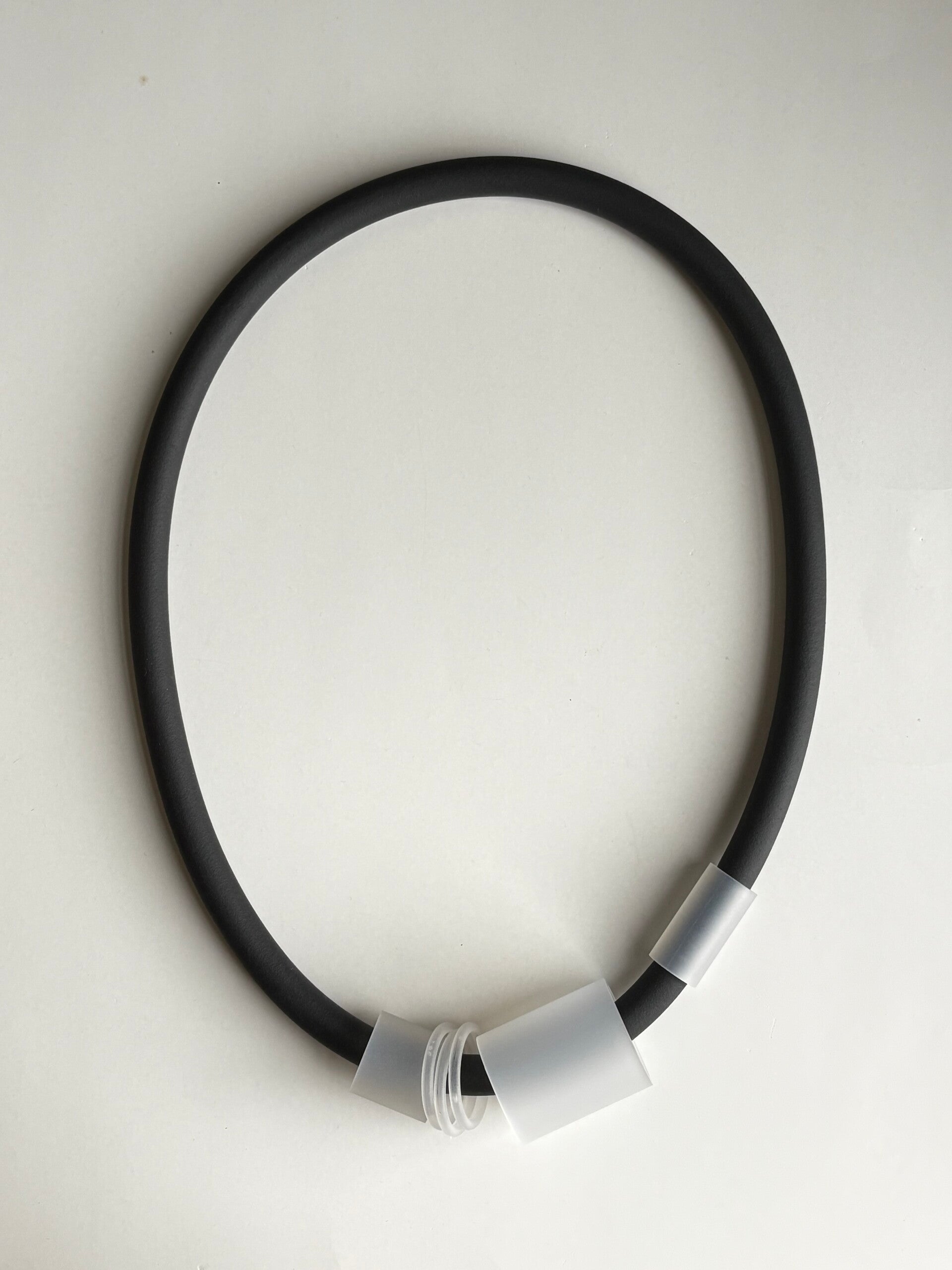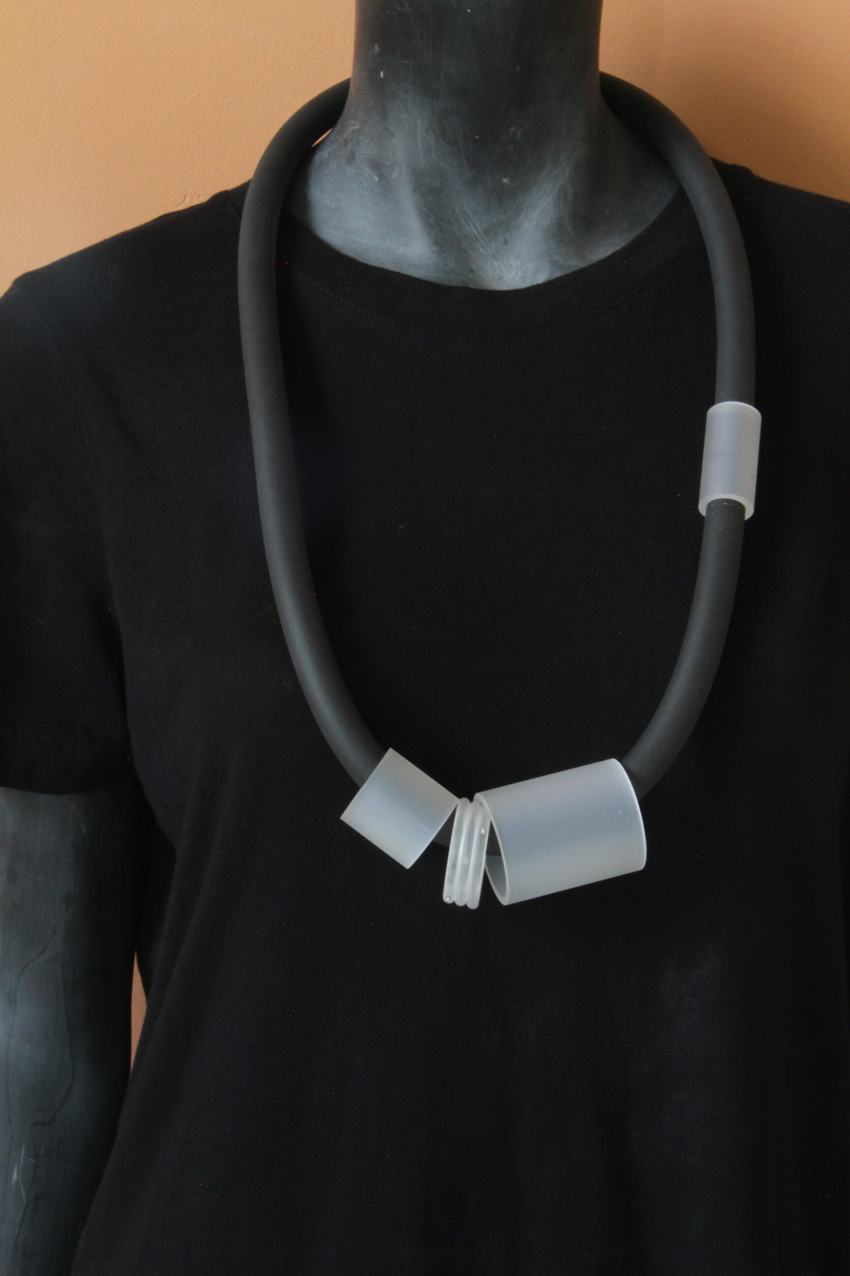 Ketting van super licht foam-rubber koord en buisjes van mat acrylaat.