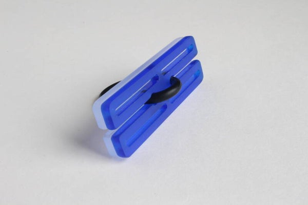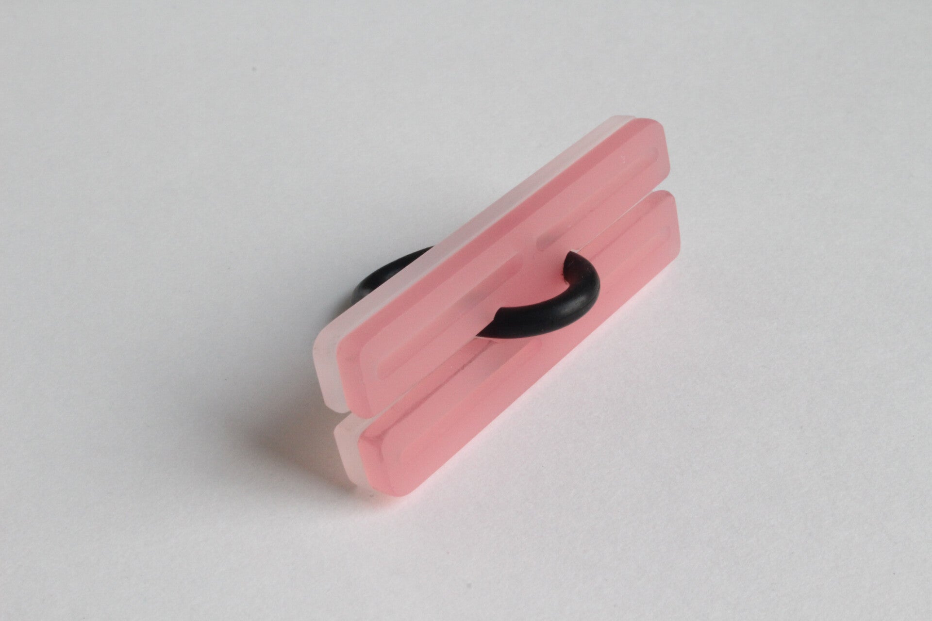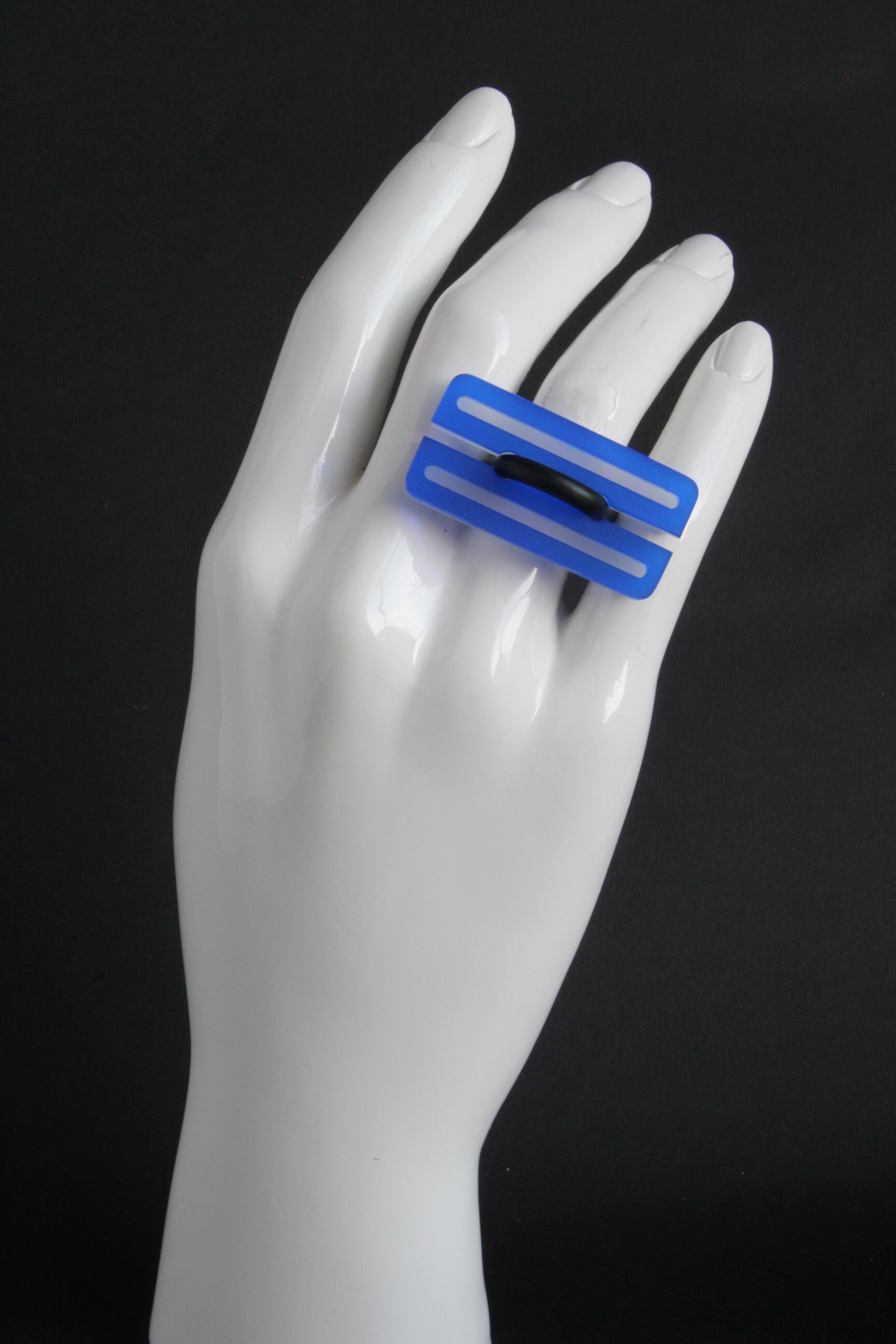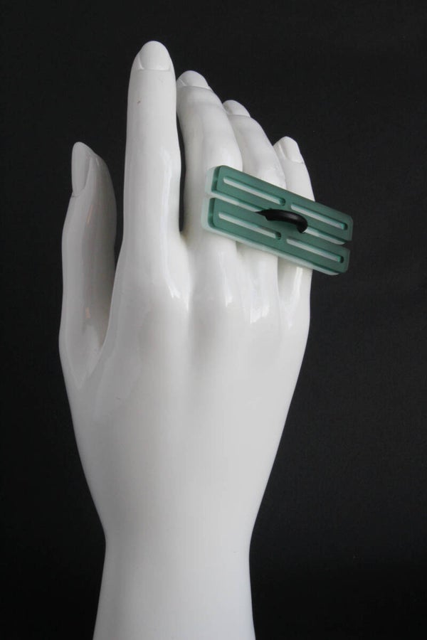Ring van mat opaal en gekleurd semi transparant acrylaat aan rubberen ring.