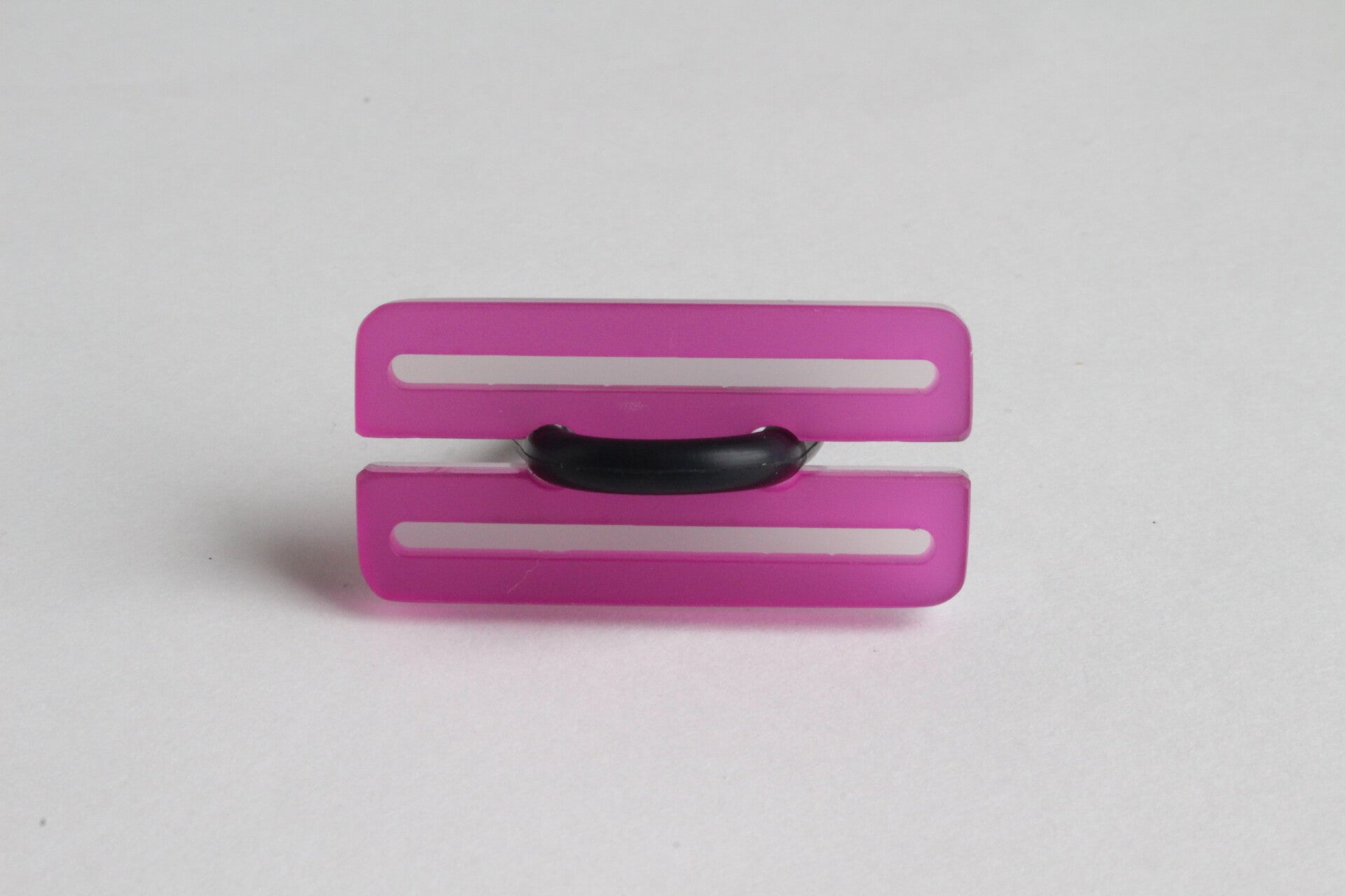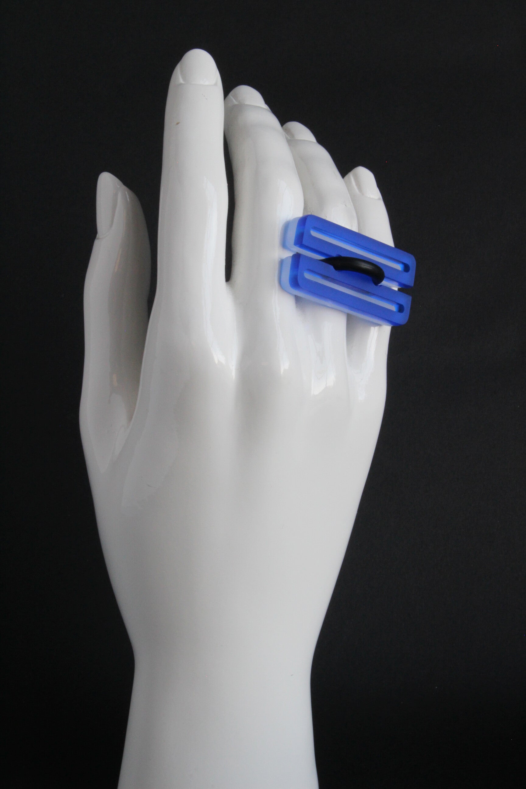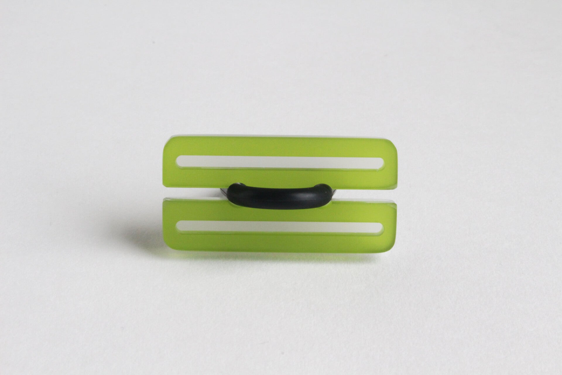 Ring van mat opaal en gekleurd semi transparant acrylaat aan rubberen ring.