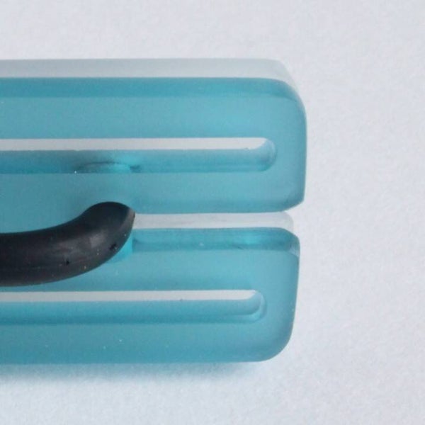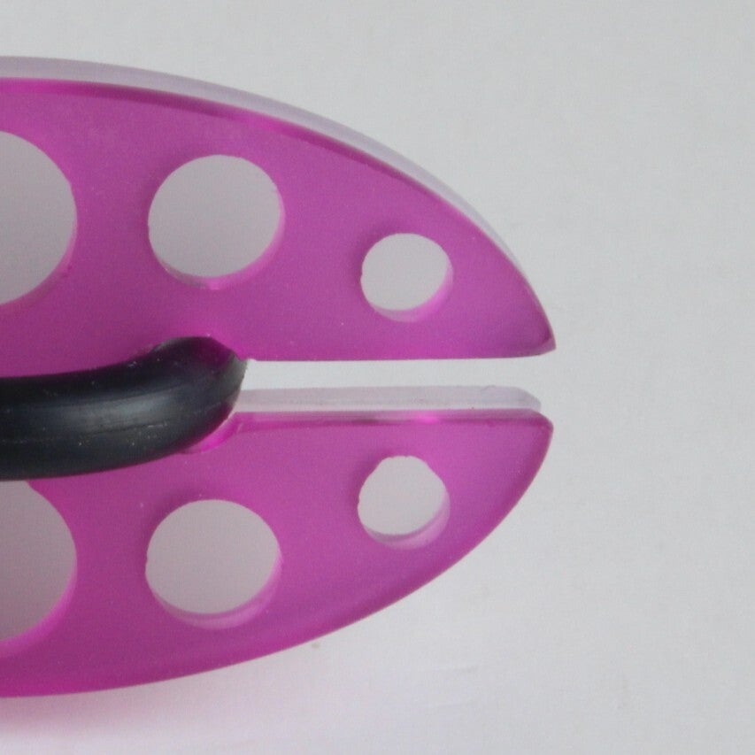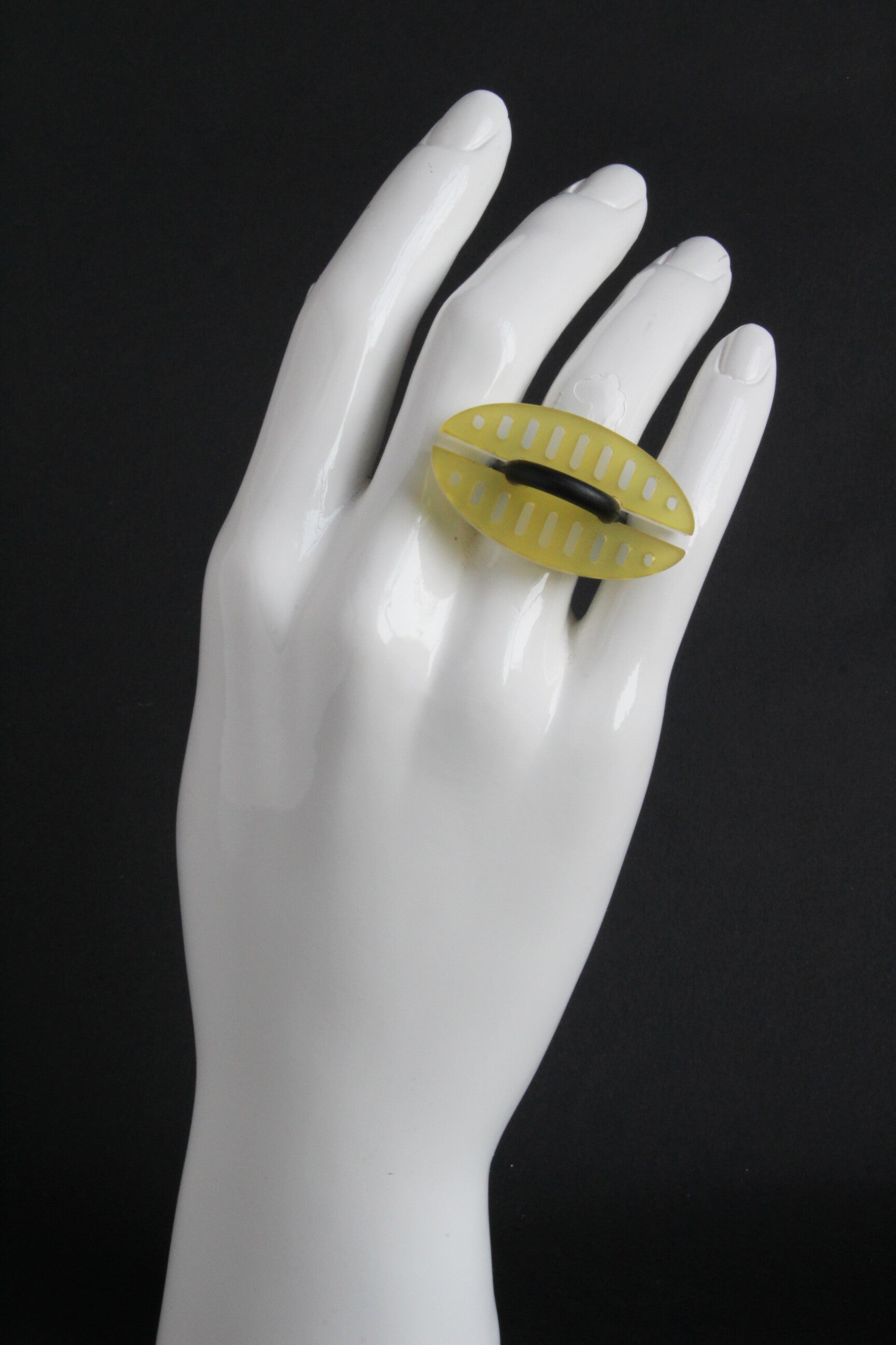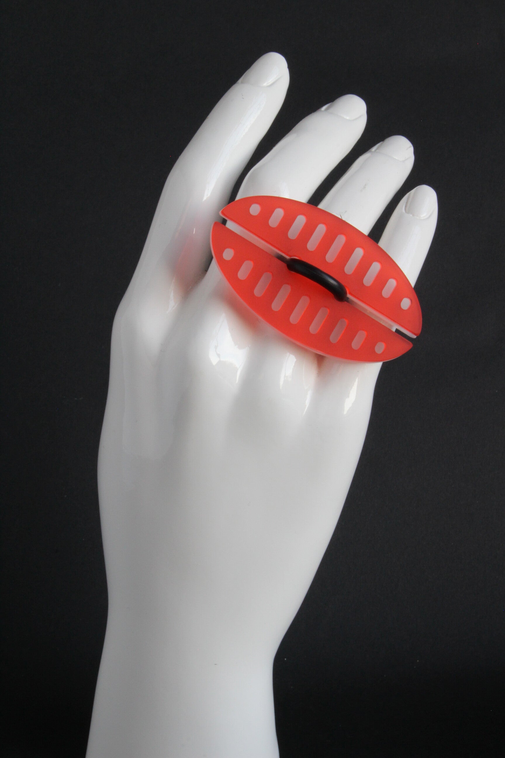 Ring van mat opaal en gekleurd semi transparant acrylaat aan rubberen ring.
