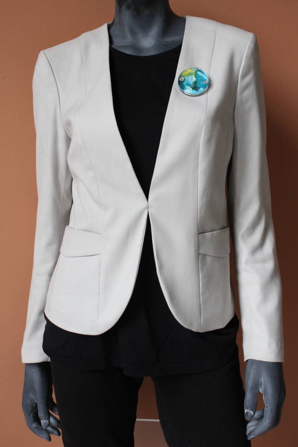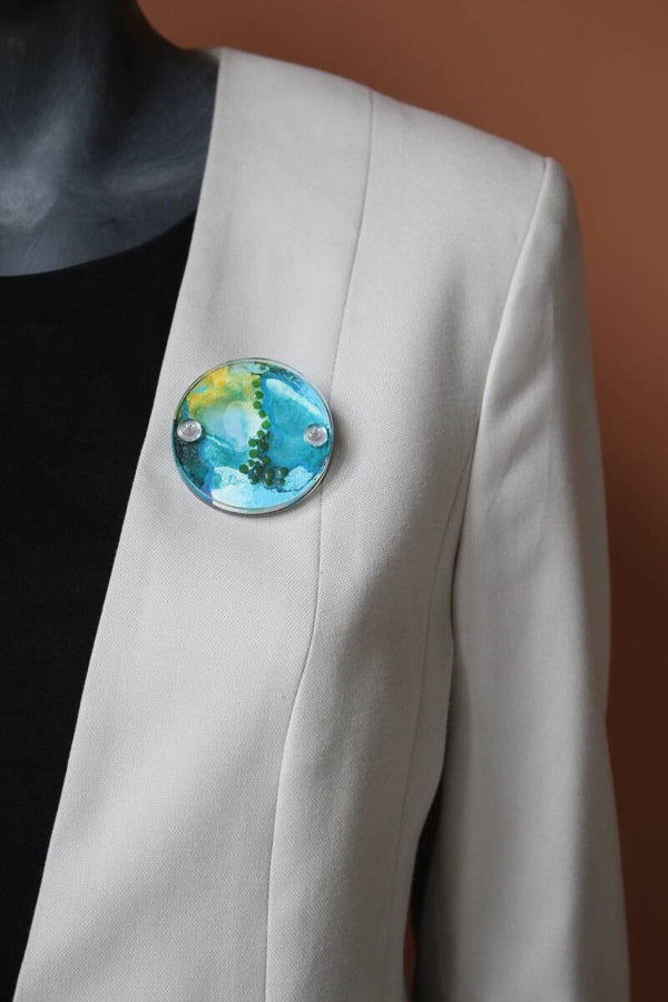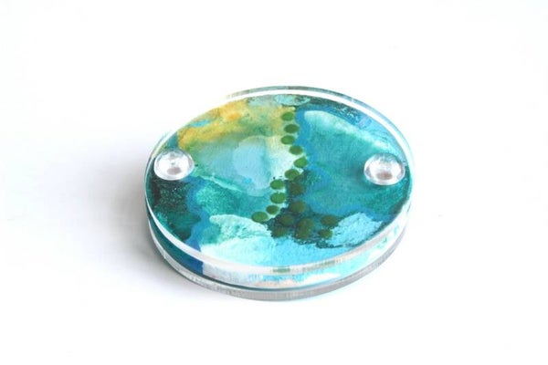 Broche van geschilderd beukenhout gevat tussen acrylaat plaatjes