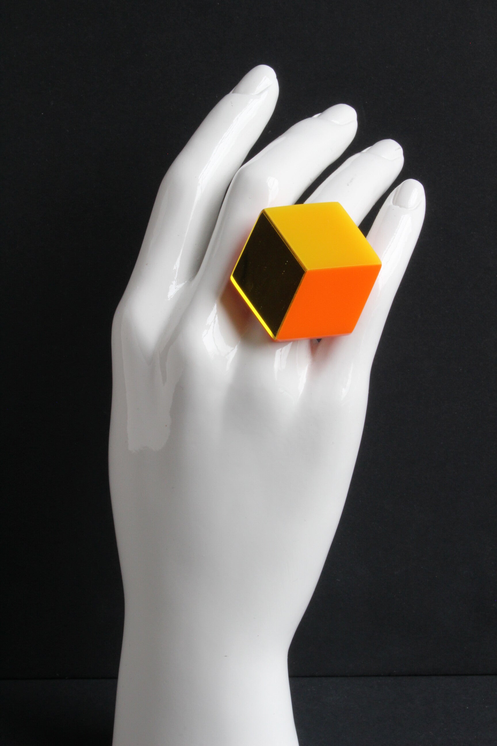 Verstelbare metalen ring "Kubus" van geel, oranje en spiegelgeel acrylaat.