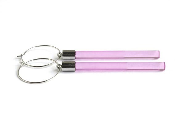 Oorbellen van transparant roze acrylaat 1/3 glans - 2/3 mat aan oorringen van rvs.