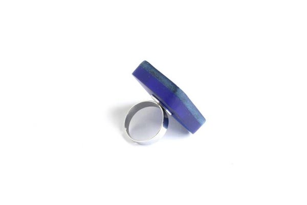 Verstelbare rvs ring (1,8 cm) van semi-transparant blauw acrylaat gelamineerd met donkerblauw tuigleer