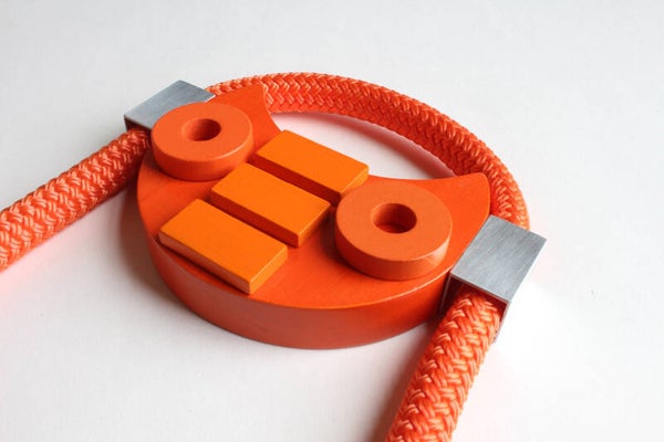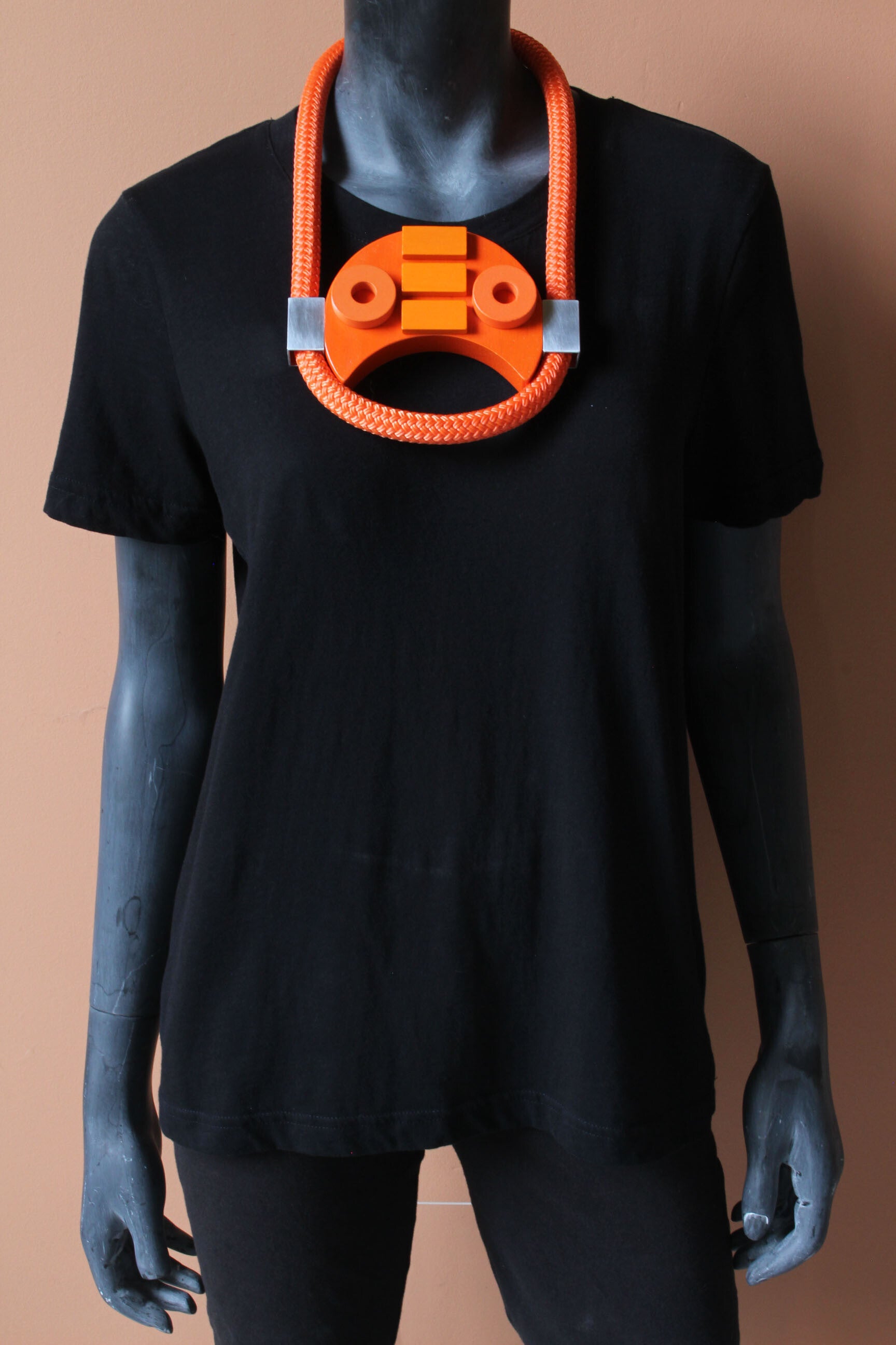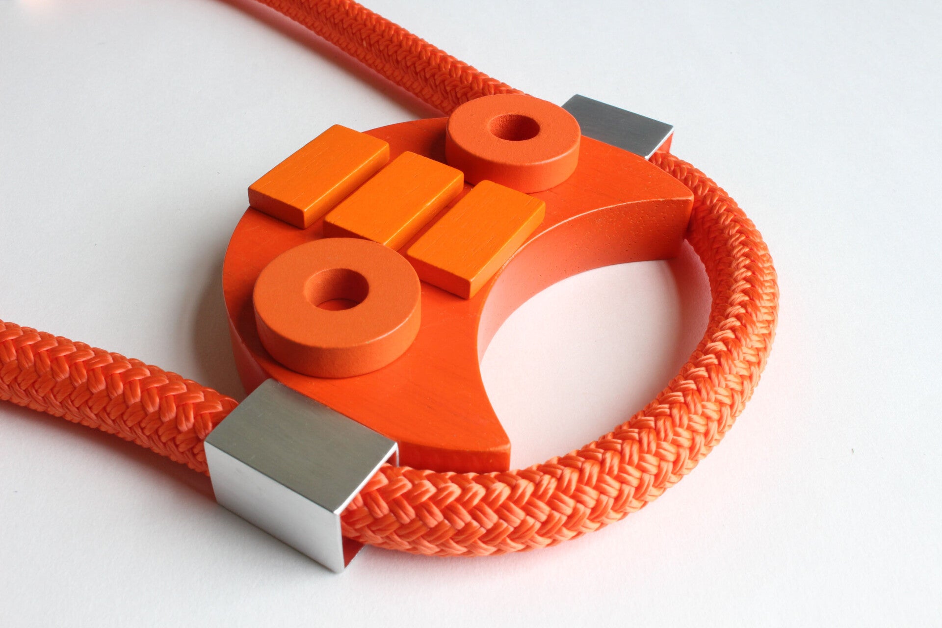 Ketting van geverfd beukenhout en aluminium aan een dubbelgevlochten koord. Bevestiging met een sterke magneetsluiting.