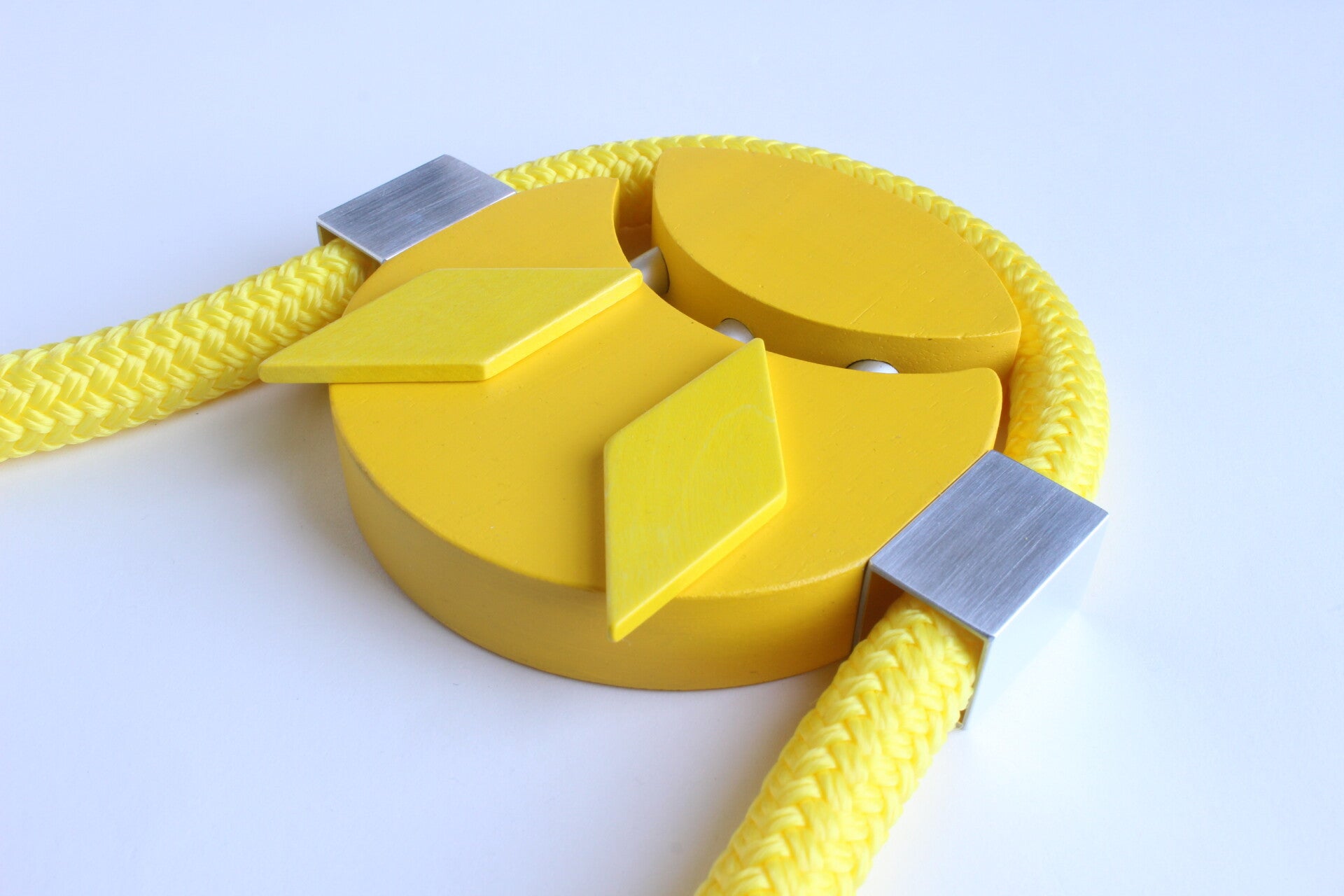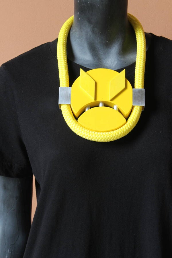 Ketting van geverfd beukenhout en aluminium aan een dubbelgevlochten koord. Bevestiging met een sterke magneetsluiting.