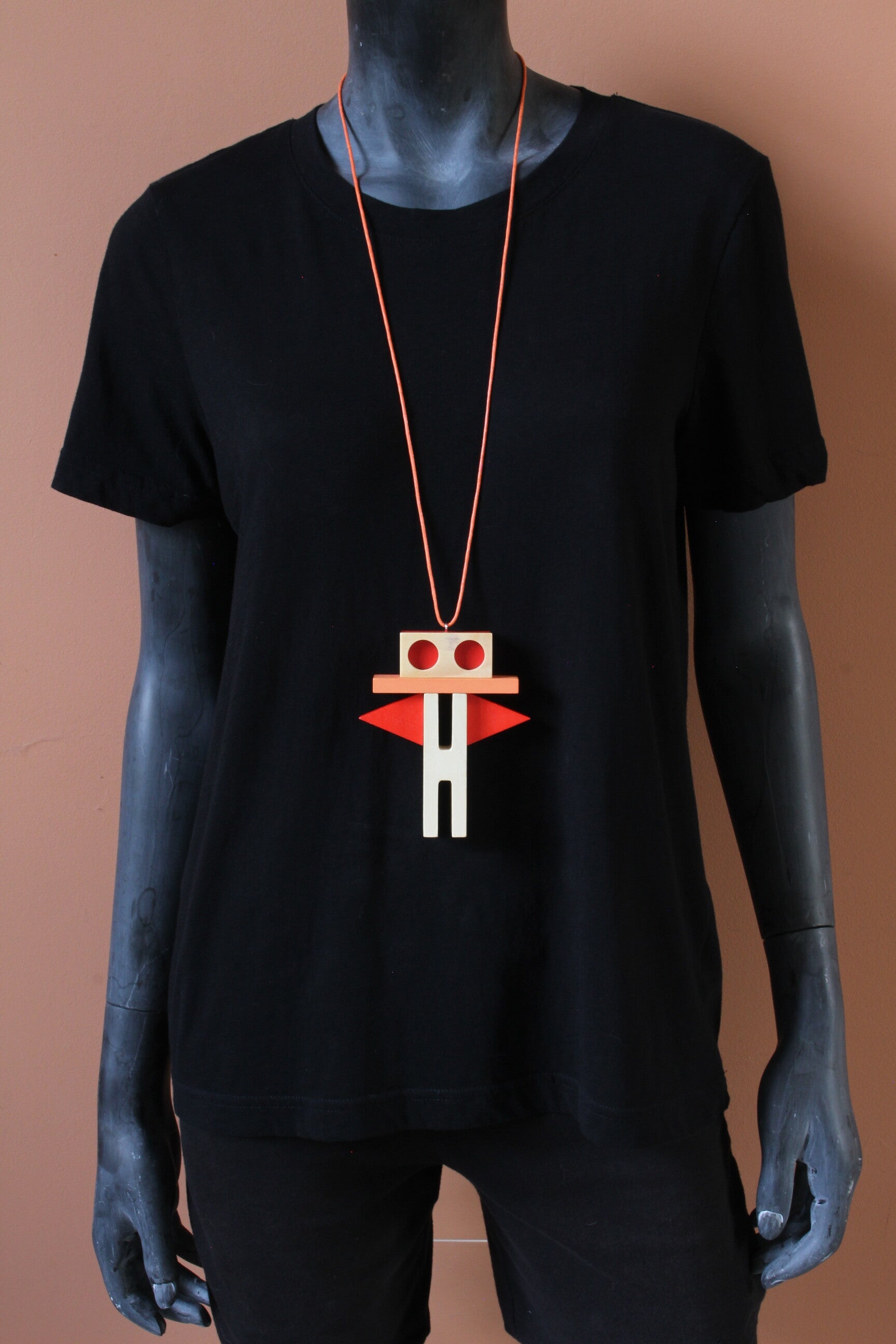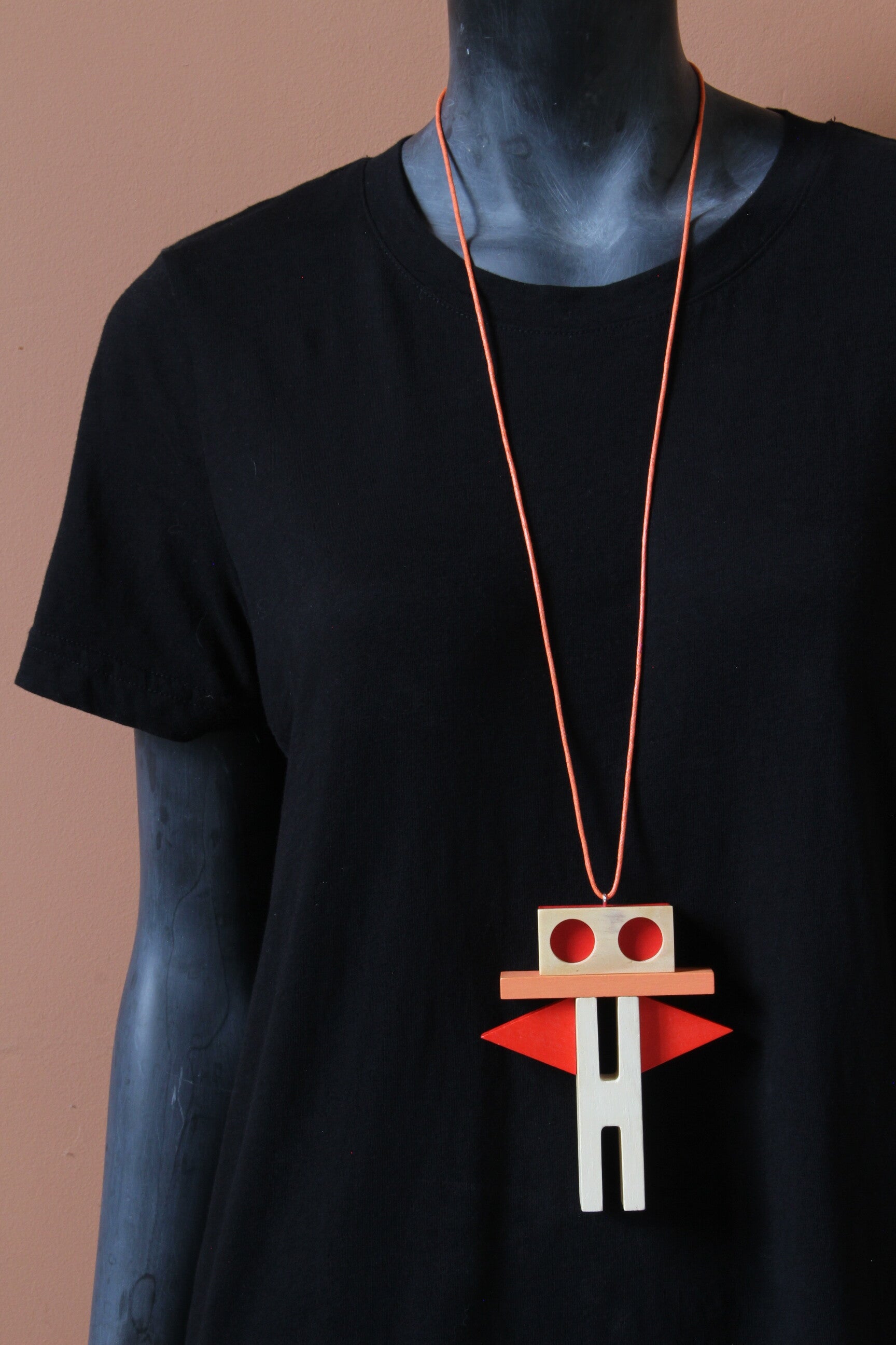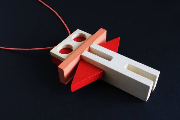 Ketting van blank en geverfd hout aan een gewaxt katoenkoord. Het koord is zelf op elke lengte vast te maken of in te korten.