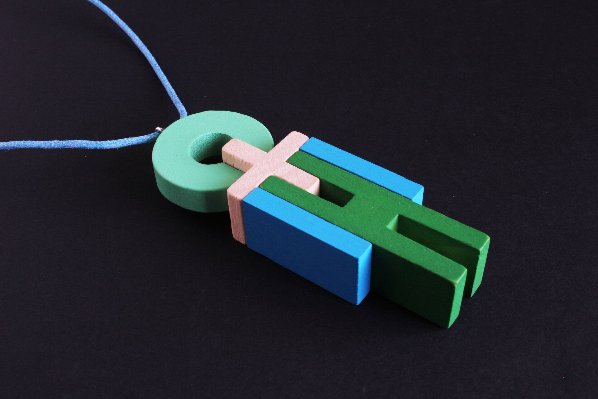 Ketting van blank en geverfd hout aan een gewaxt katoenkoord. Het koord is zelf op elke lengte vast te maken of in te korten.