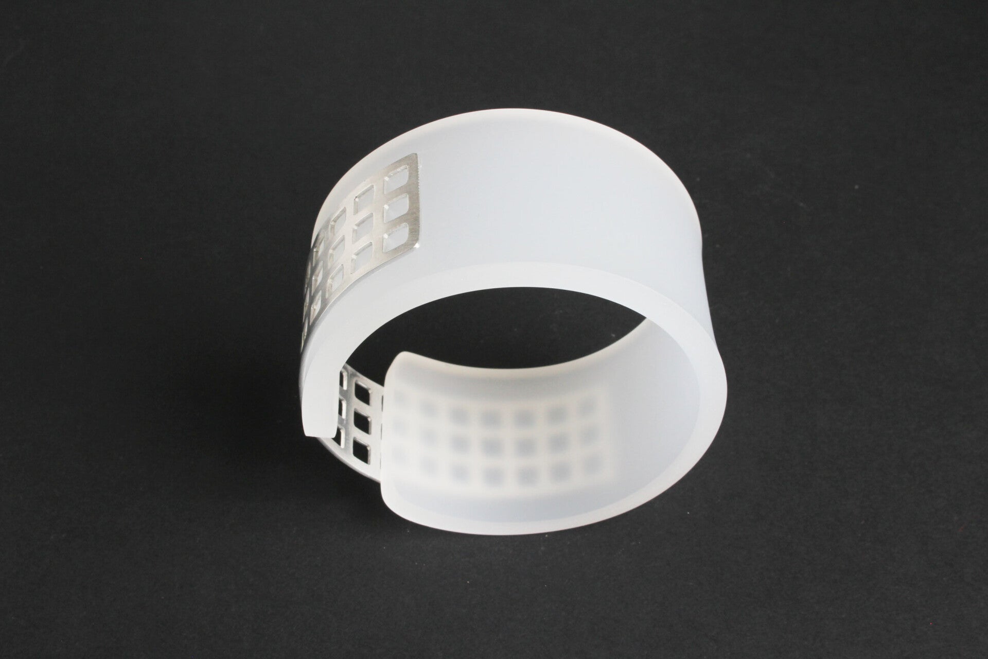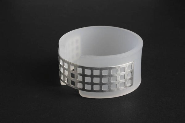 Armband van opaal wit acrylaat en aluminium. Breedte 4 cm. binnenmaat 6,8 cm
