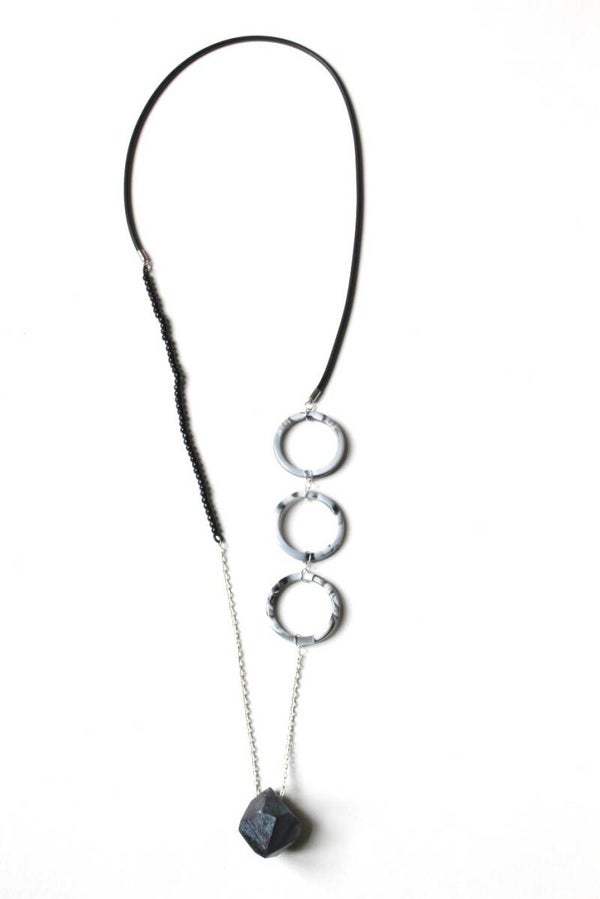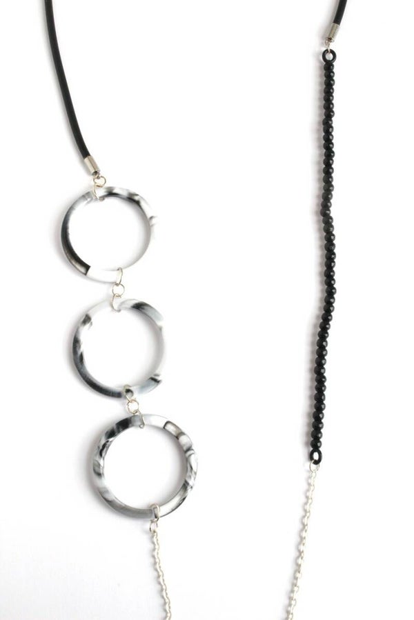Hanger van geverfd beukenhout aan een ketting van metaal, acrylaat ringen, beukenhouten kralen en rubberkoord