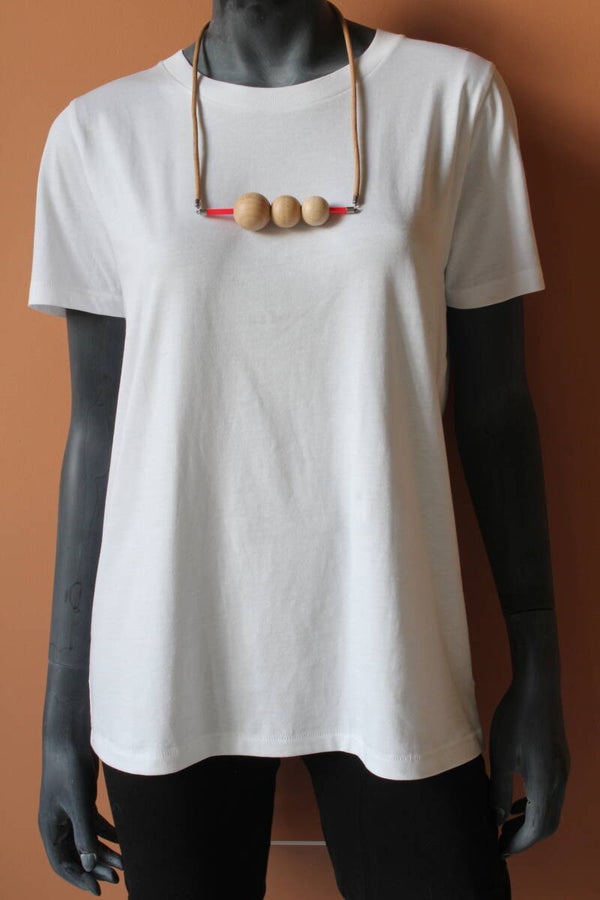 Hanger van acrylaat met kralen van beukenhout aan een leder koord. De hanger is voorzien van een wax om het materiaal te beschermen tegen vocht en vuil.