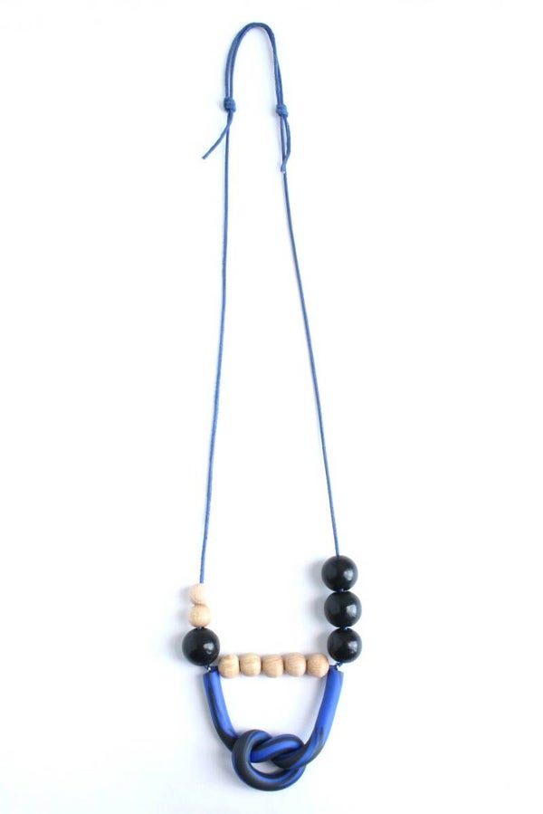 Hanger van polymeer en beukenhouten kralen aan een leder koord. De hanger is voorzien van een wax om het materiaal te beschermen tegen vocht en vuil.