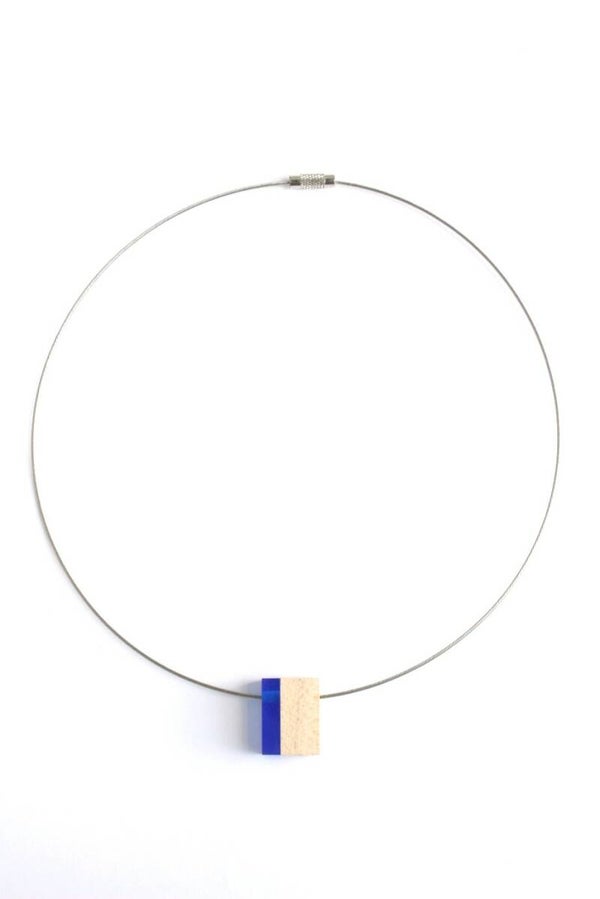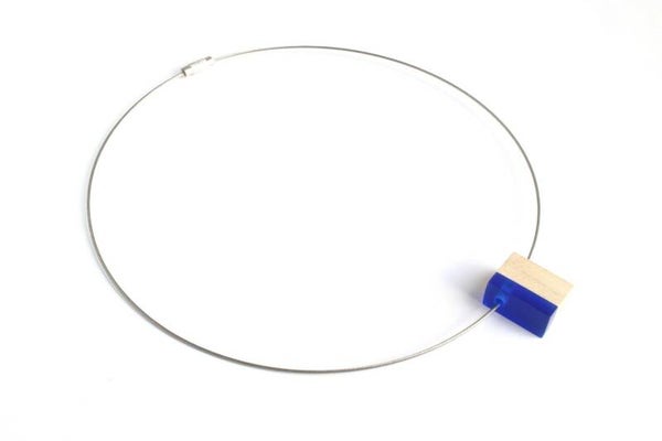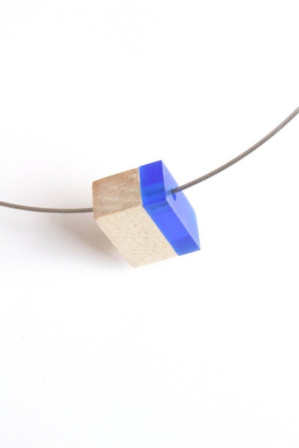 Hanger van transparant blauw acrylaat en beukenhout aan een zilverkleurige spang van staaldraad met een draaisluiting. De hanger is voorzien van een wax om het materiaal te beschermen tegen vocht en vuil.