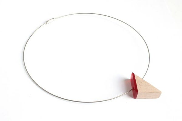 Hanger van transparant rood acrylaat en beukenhout aan een zilverkleurige spang van staaldraad met een draaisluiting. De hanger is voorzien van een wax om het materiaal te beschermen tegen vocht en vuil.