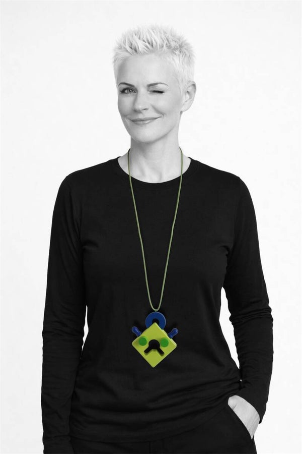 Ketting van geverfd hout en kunststof aan een gewaxt katoenkoord. Het koord is zelf op elke lengte vast te maken of in te korten.