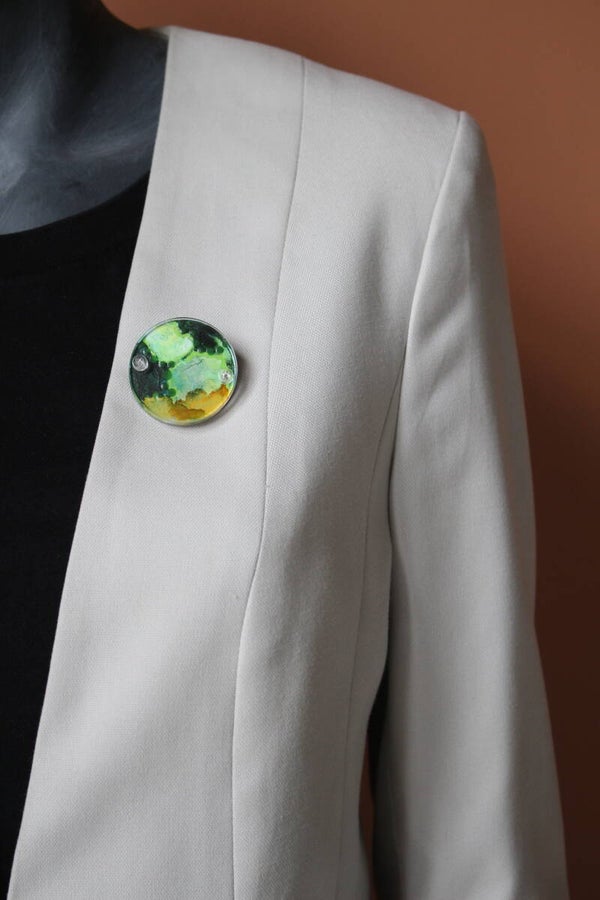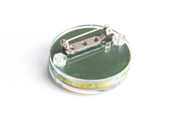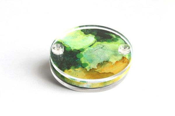 Broche van geschilderd beukenhout gevat tussen acrylaat plaatjes