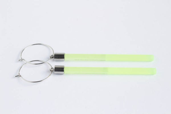 Oorbellen van transparant fluor lichtgroen acrylaat 1/2 glans - 1/2 mat aan oorringen van rvs.
