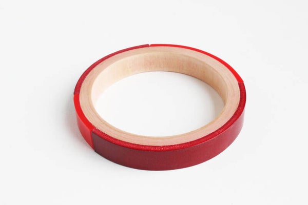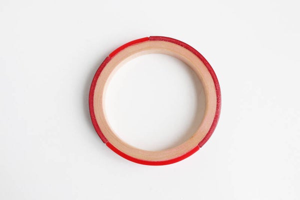 Armband van hout gelamineerd met donkerrood tuigleer en rood acrylaat. Dikte 1,3 cm, binnenmaat 7 cm doorsnee