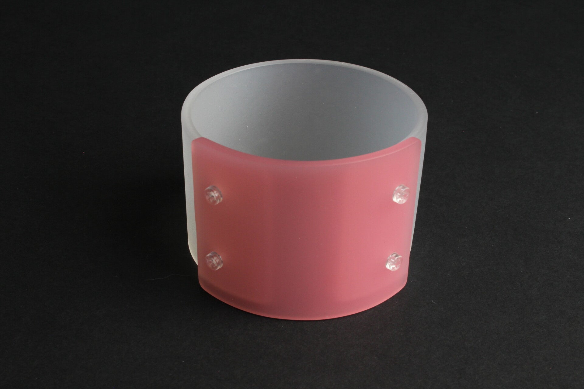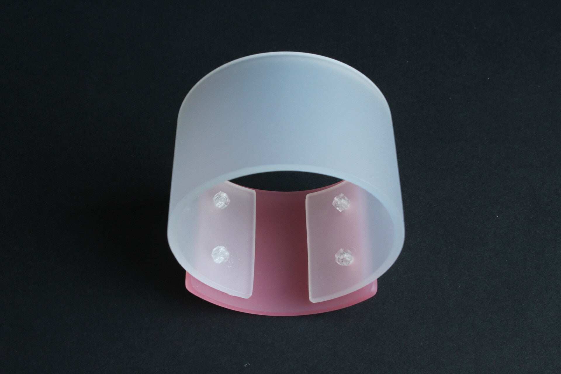 Armband van opaal wit en opaal roze acrylaat. De delen zijn vastgezet met boutjes en moertjes van transparant acrylaat.