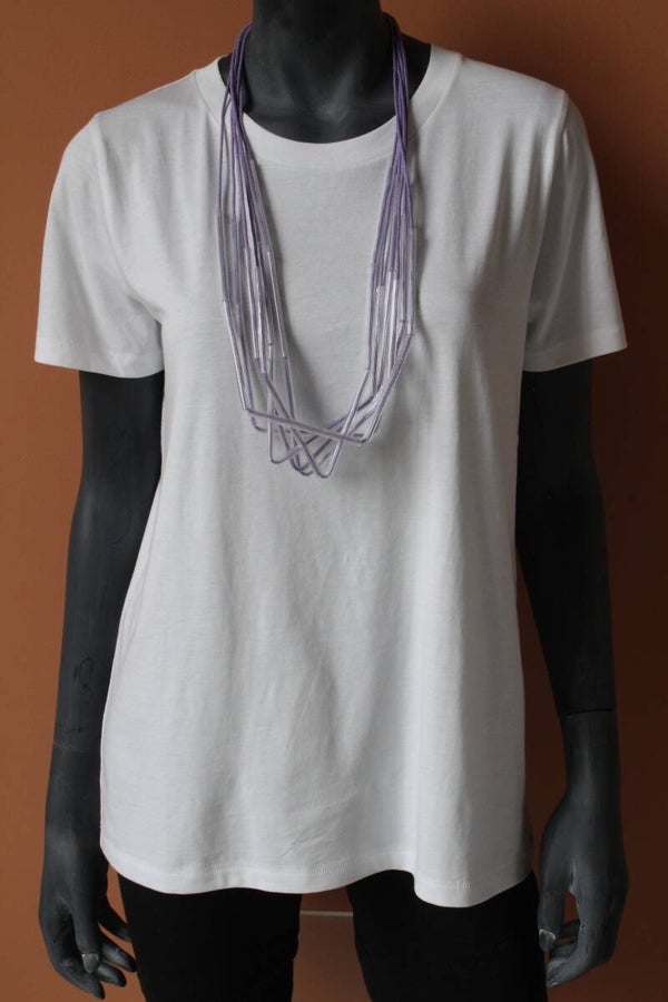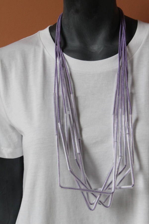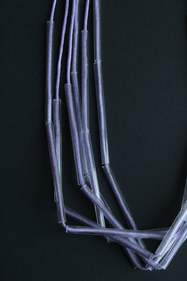Lange ketting van glasstaafjes aan lila gewaxt katoen koord
