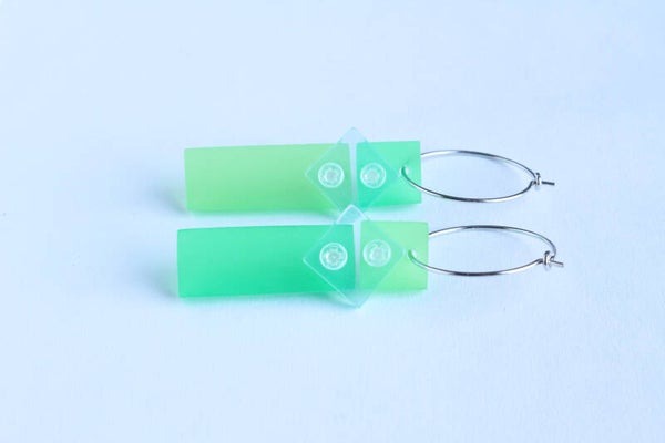 Mismatch oorbellen van acrylaat aan oorringen van rvs. Set van twee verschillende, maar toch bij elkaar passende oorbellen.
