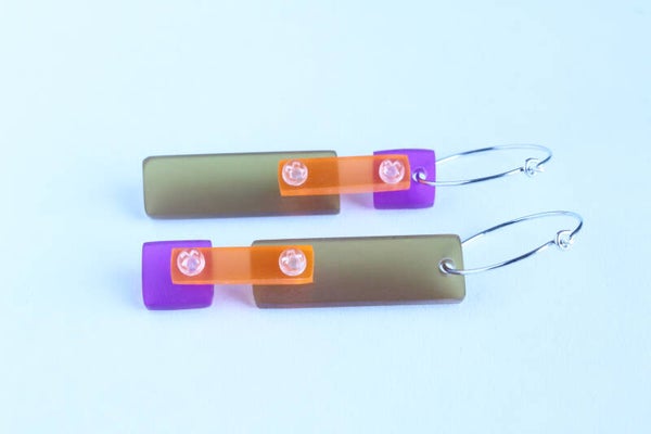 Mismatch oorbellen van acrylaat aan oorringen van rvs. Set van twee verschillende, maar toch bij elkaar passende oorbellen.