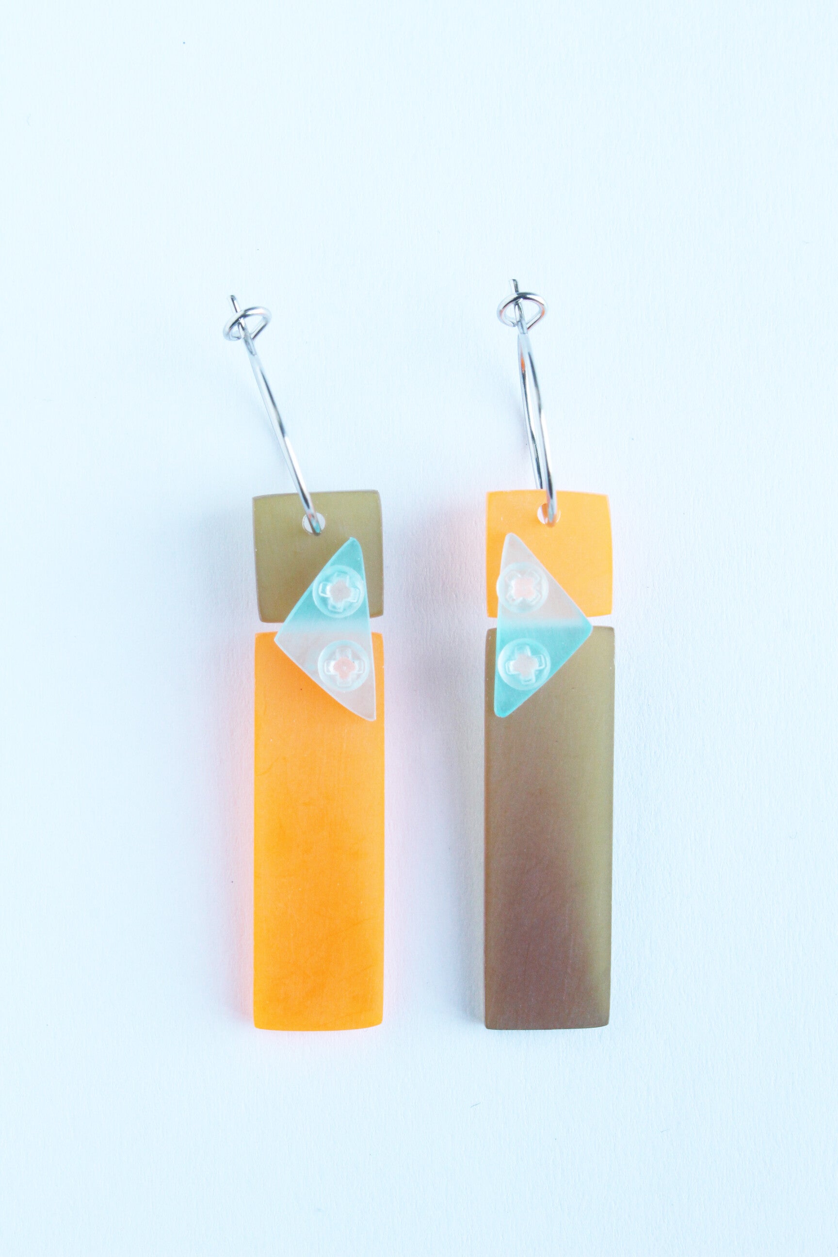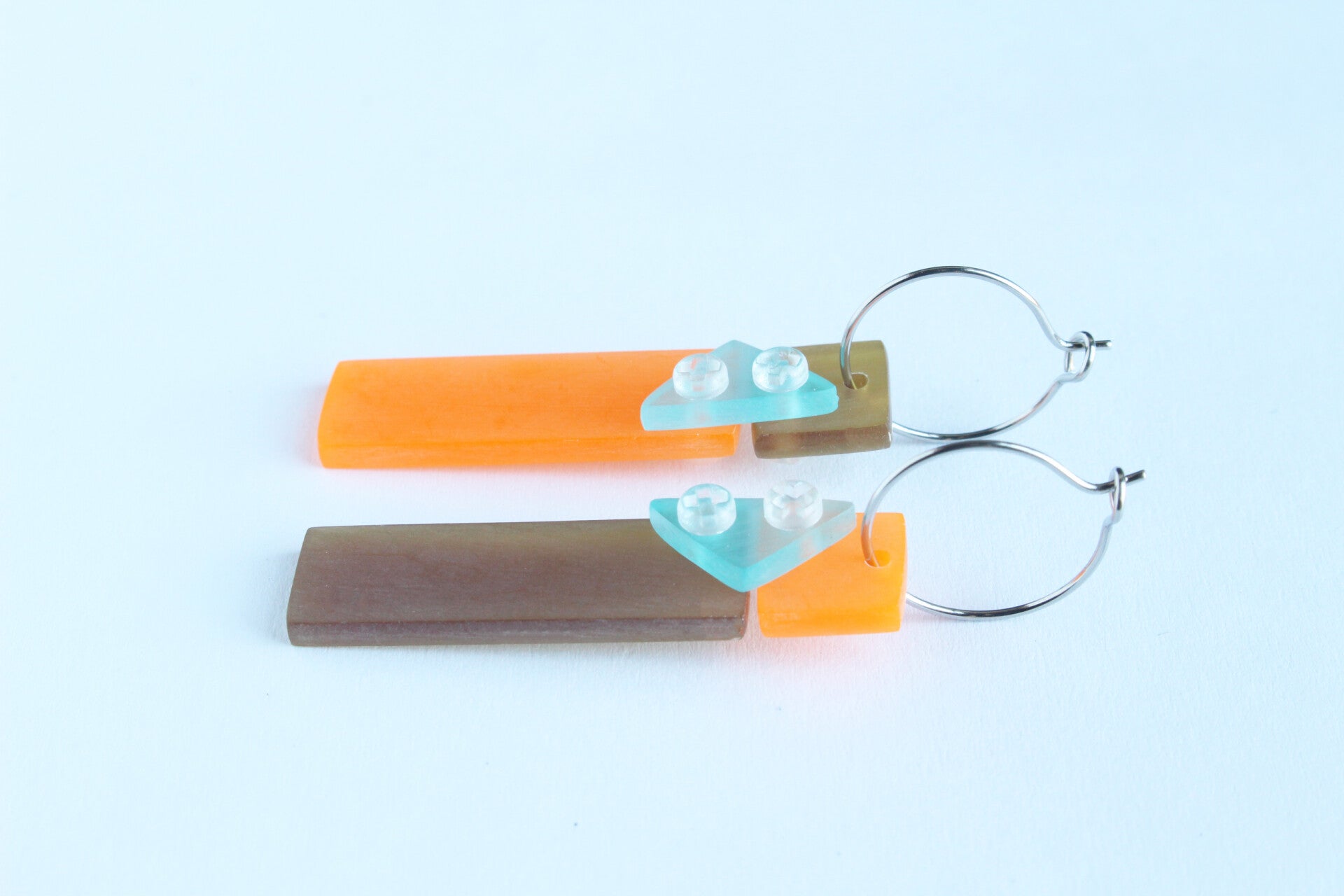 Mismatch oorbellen van acrylaat aan oorringen van rvs . Set van twee verschillende, maar toch bij elkaar passende oorbellen.