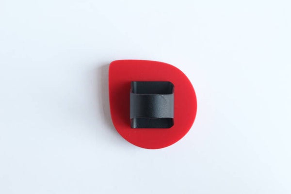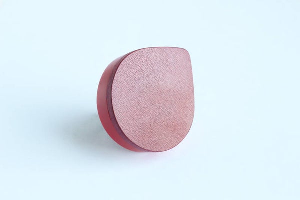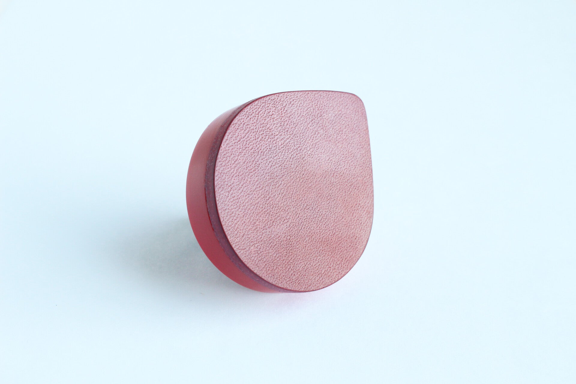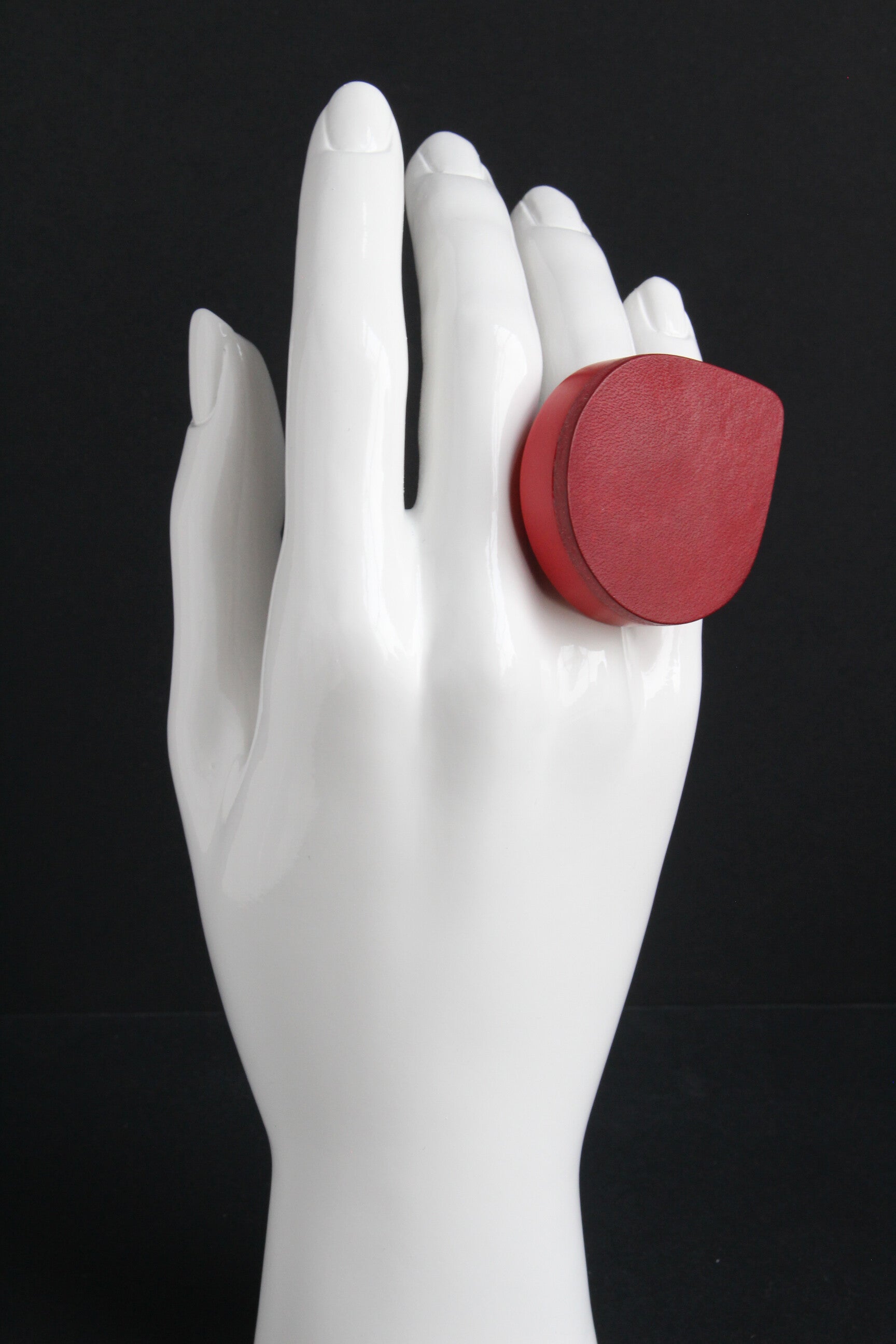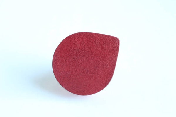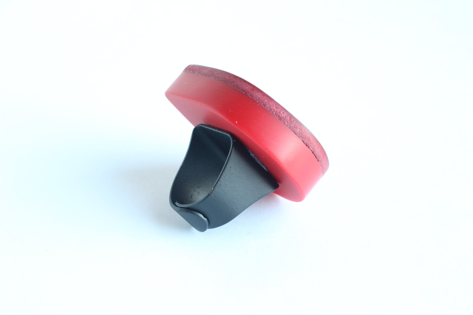 Verstelbare zwart gecoate metalen ring van rood acrylaat gelamineerd met donkerrood tuigleer.