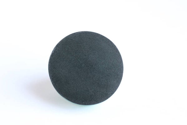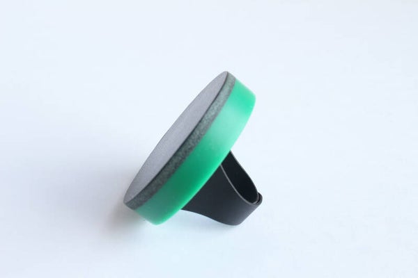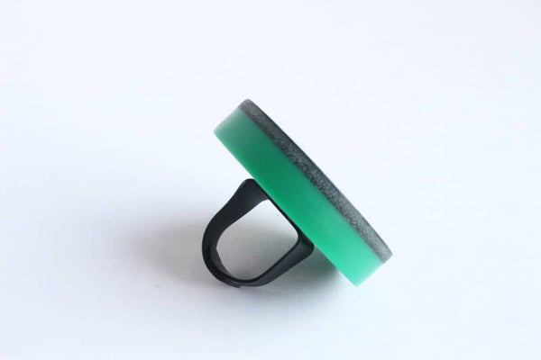 Verstelbare zwart gecoate metalen ring van groen acrylaat gelamineerd met donkergroen tuigleer.
