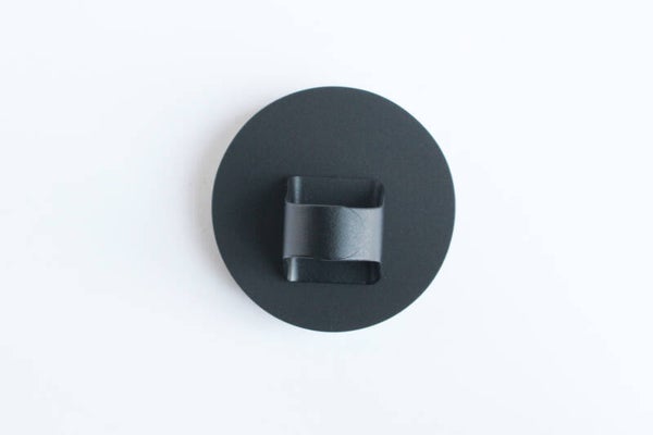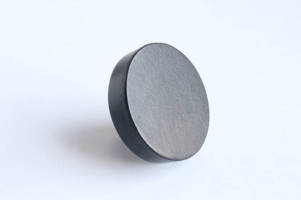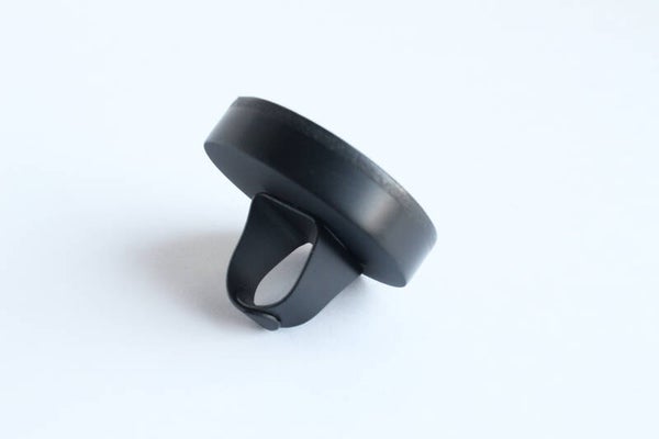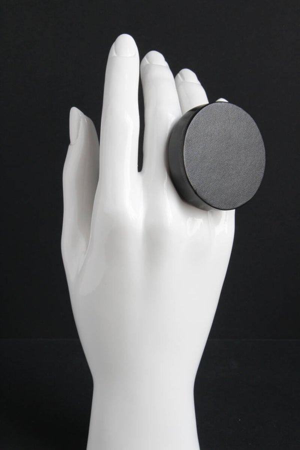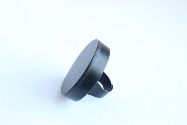 Verstelbare zwart gecoate metalen ring van zwart acrylaat gelamineerd met zwart tuigleer.
