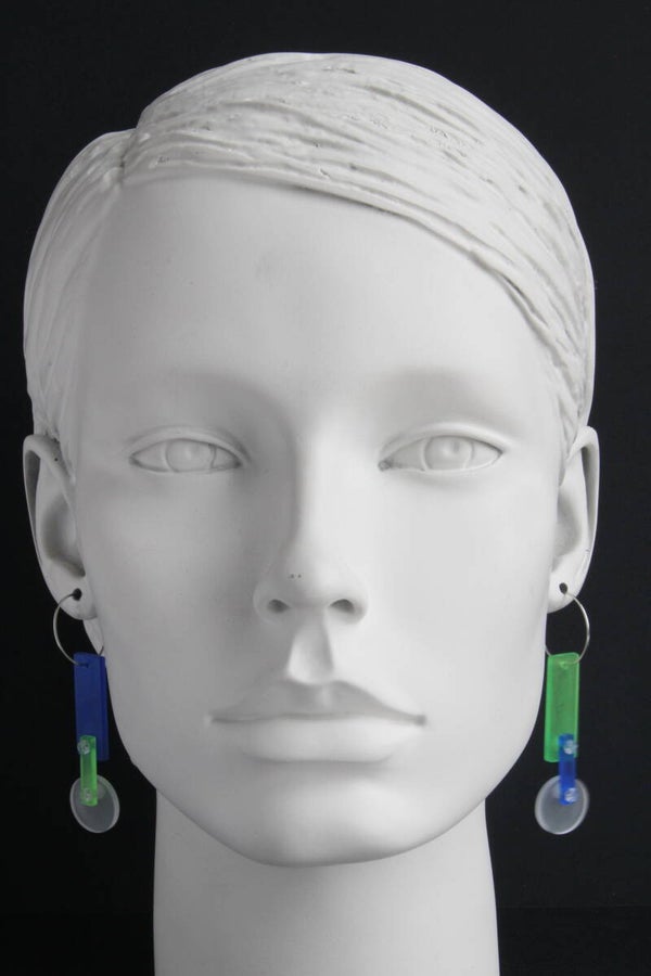 Mismatch oorbellen van acrylaat aan oorringen van rvs. Set van twee verschillende, maar toch bij elkaar passende oorbellen.