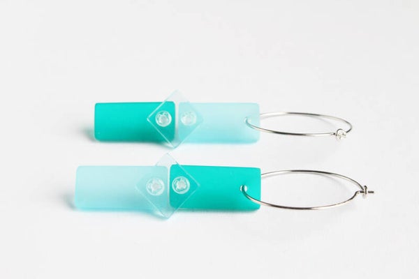 Mismatch oorbellen van acrylaat aan oorringen van rvs. Set van twee verschillende, maar toch bij elkaar passende oorbellen.