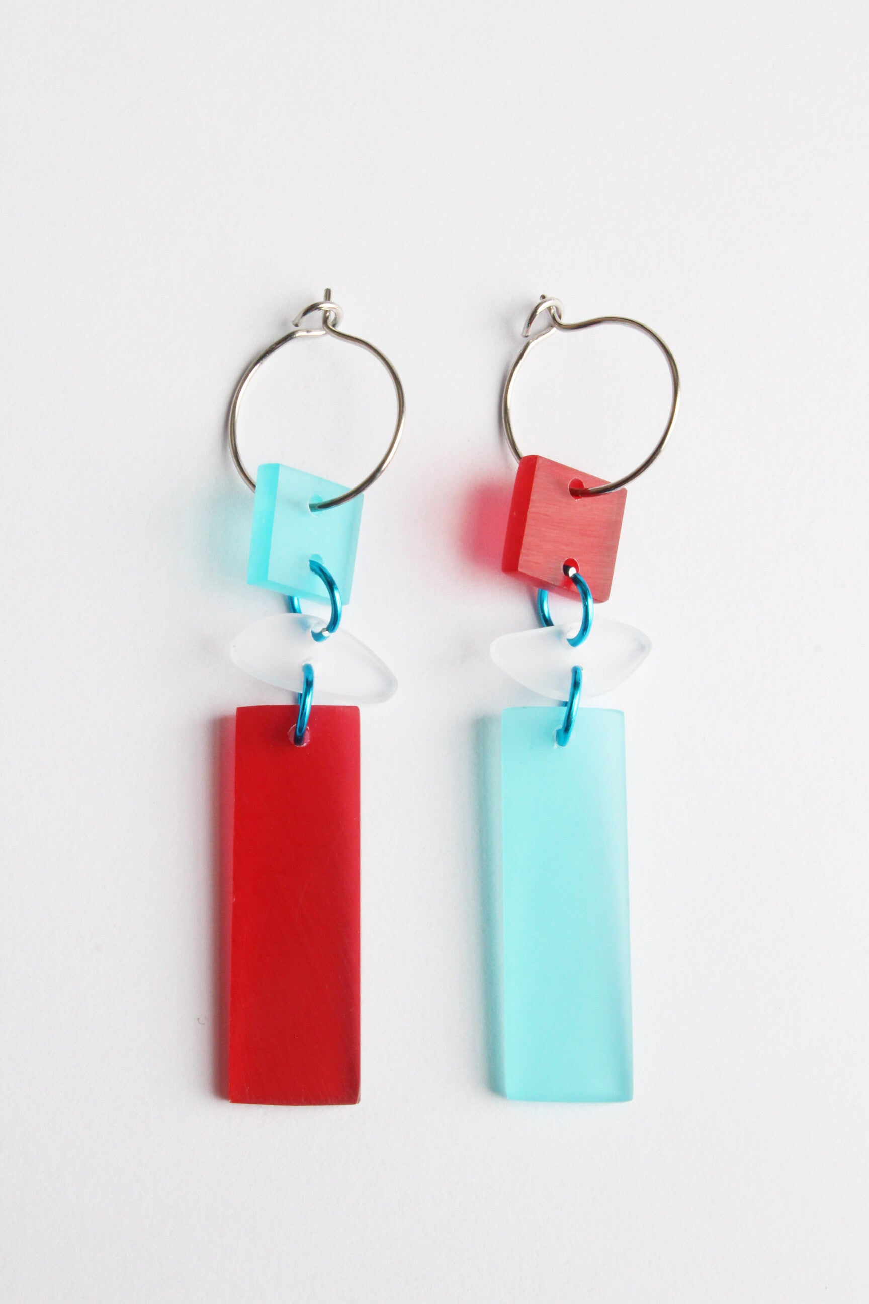 Mismatch oorbellen van acrylaat aan oorringen van rvs. Set van twee verschillende, maar toch bij elkaar passende oorbellen.