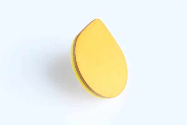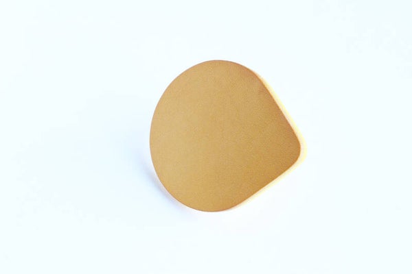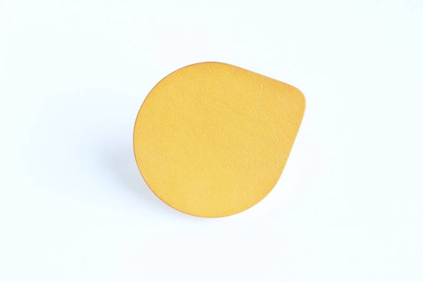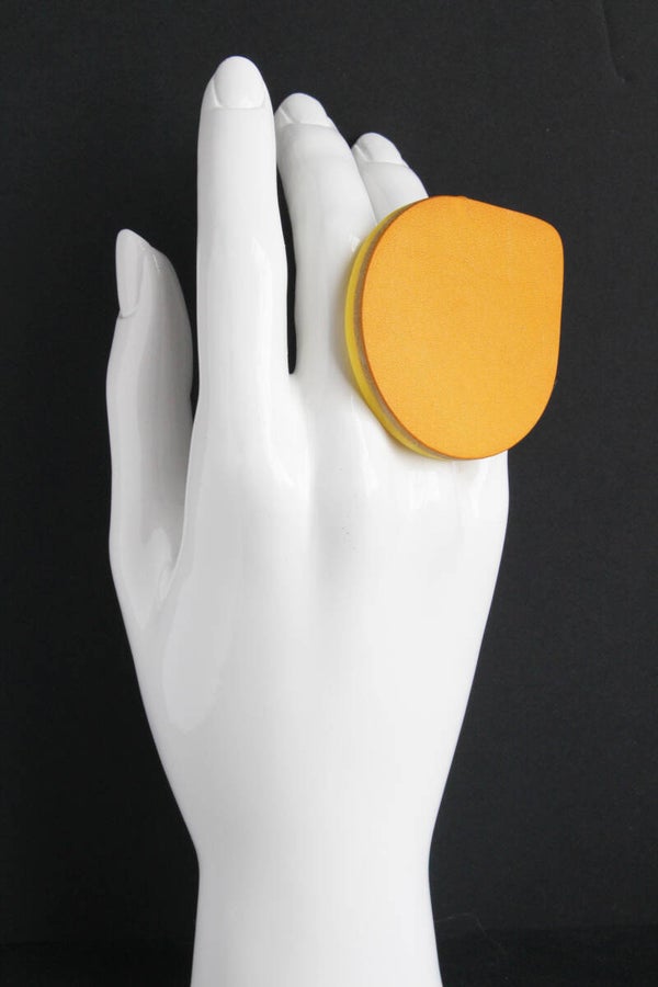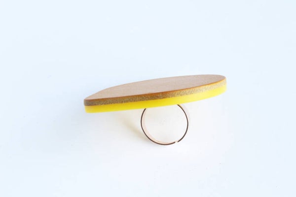 Verstelbare rosé goud metalen ring van geel acrylaat gelamineerd met geel tuigleer.