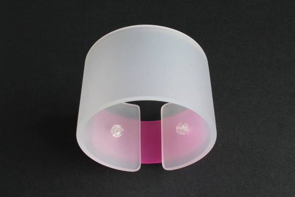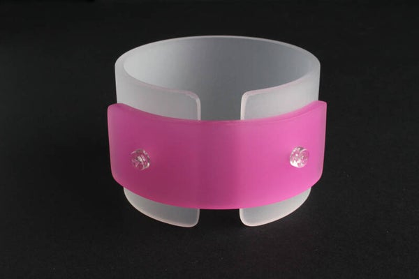 Armband van opaal wit en opaal roze acrylaat. De delen zijn vastgezet met boutjes en moertjes van transparant acrylaat.