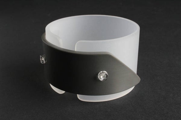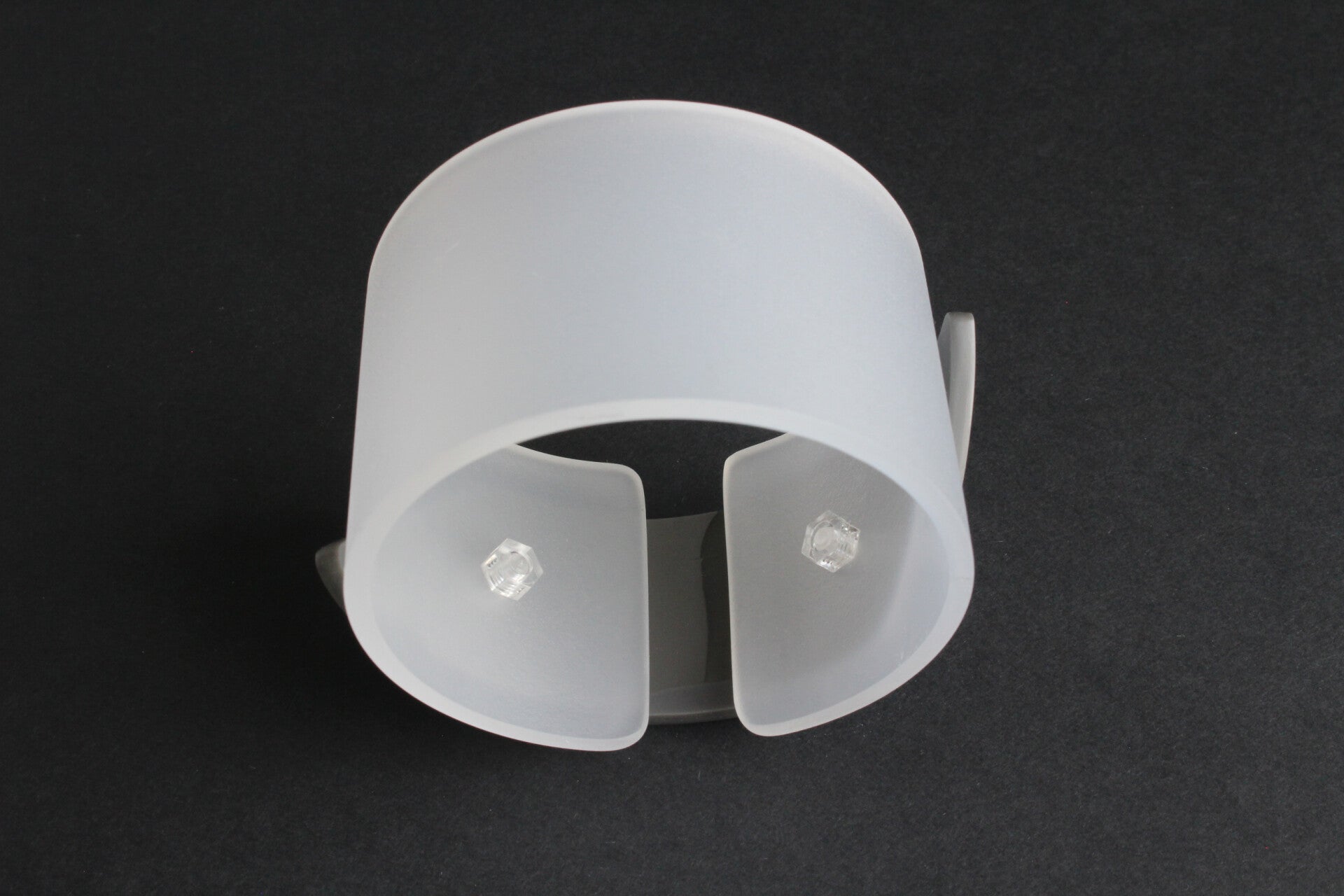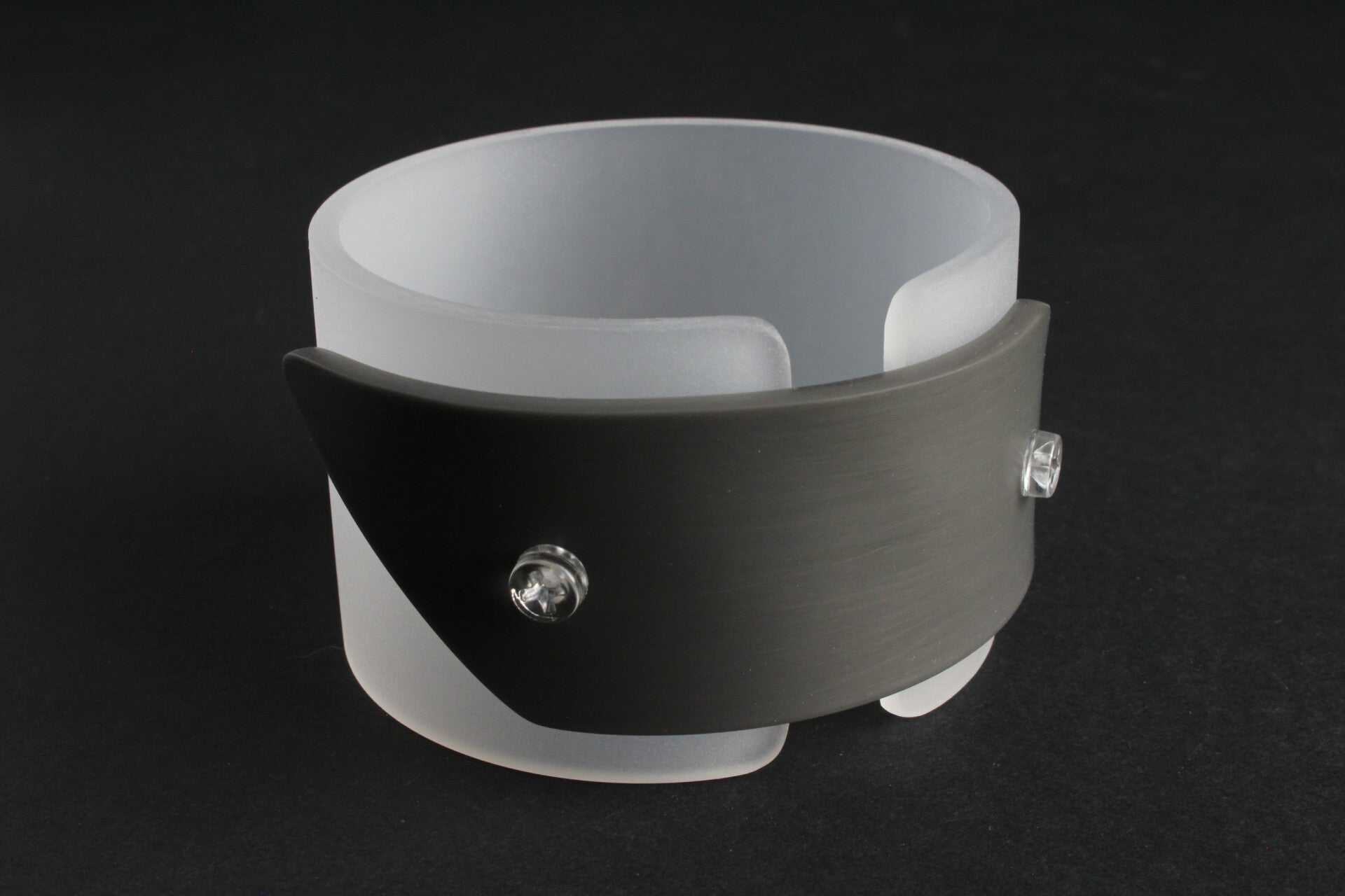 Armband van opaal wit en opaque grijs acrylaat. De delen zijn vastgezet met boutjes en moertjes van transparant acrylaat.