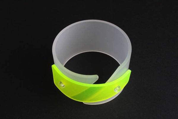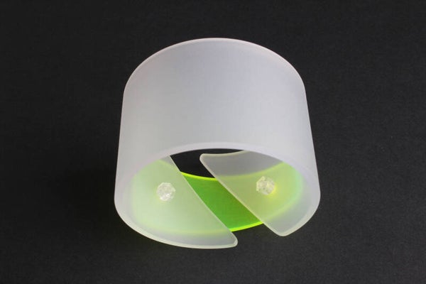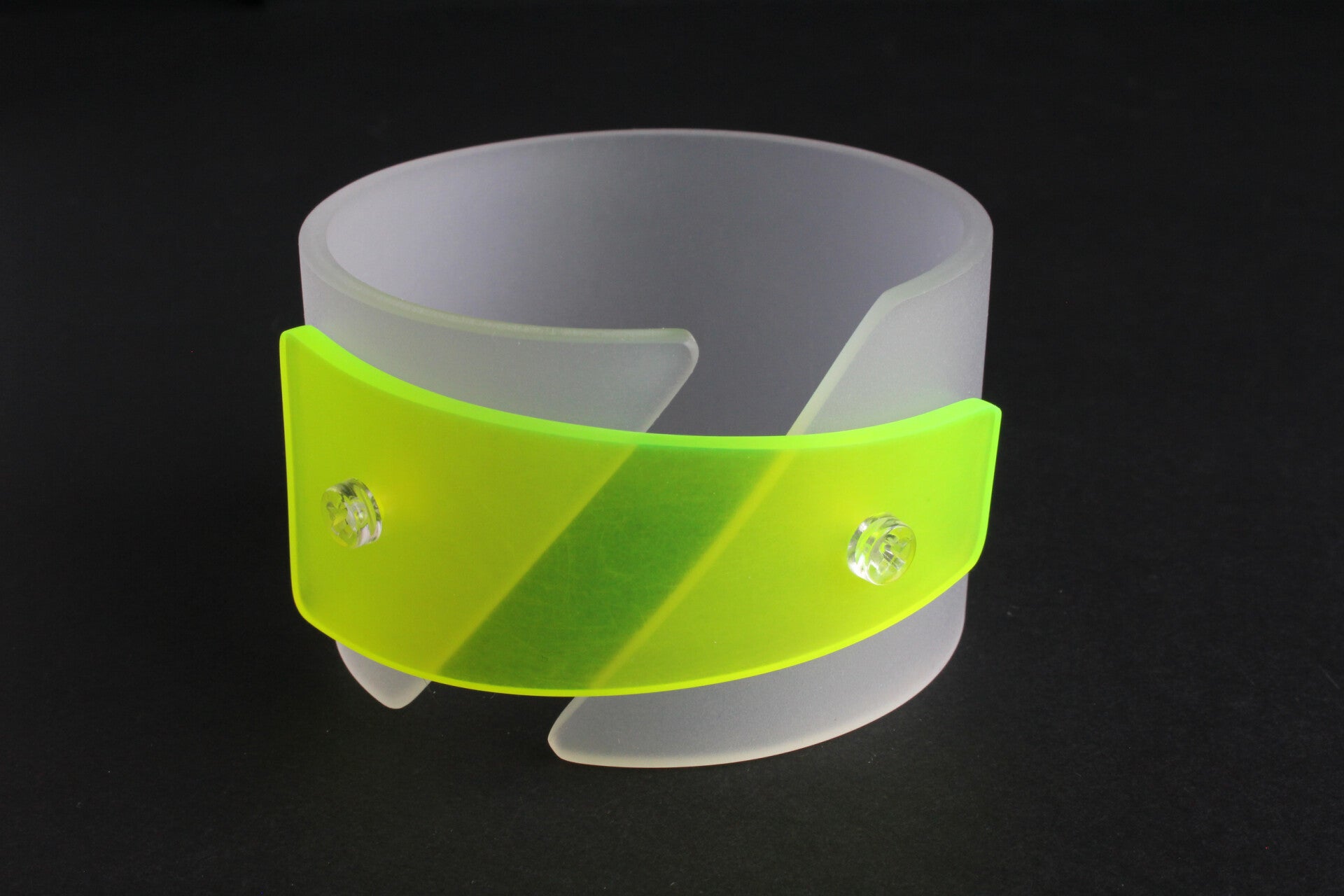 Armband van opaal wit en opaal fluor lichtgroen acrylaat. De delen zijn vastgezet met boutjes en moertjes van transparant acrylaat.