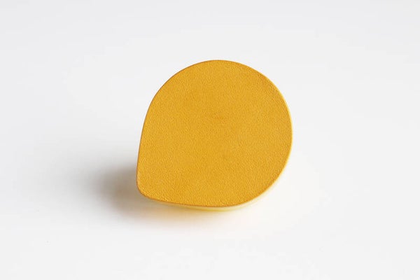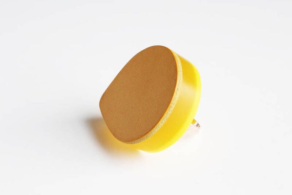 Verstelbare rosé goud metalen ring van opaal en opaque geel acrylaat gelamineerd met geel tuigleer.