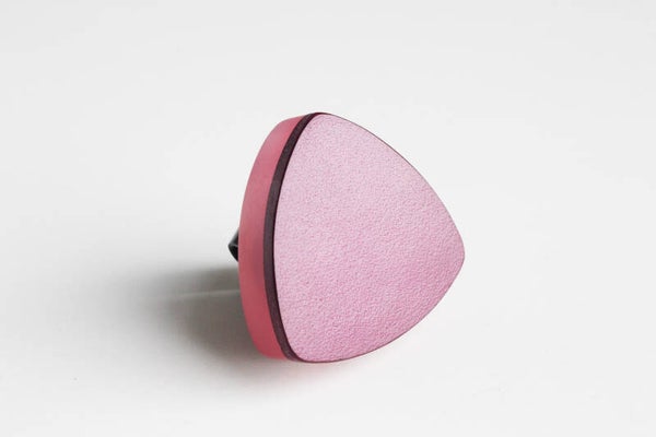 Verstelbare zwart gecoate metalen ring van opaal roze acrylaat gelamineerd met wijnrood tuigleer.
