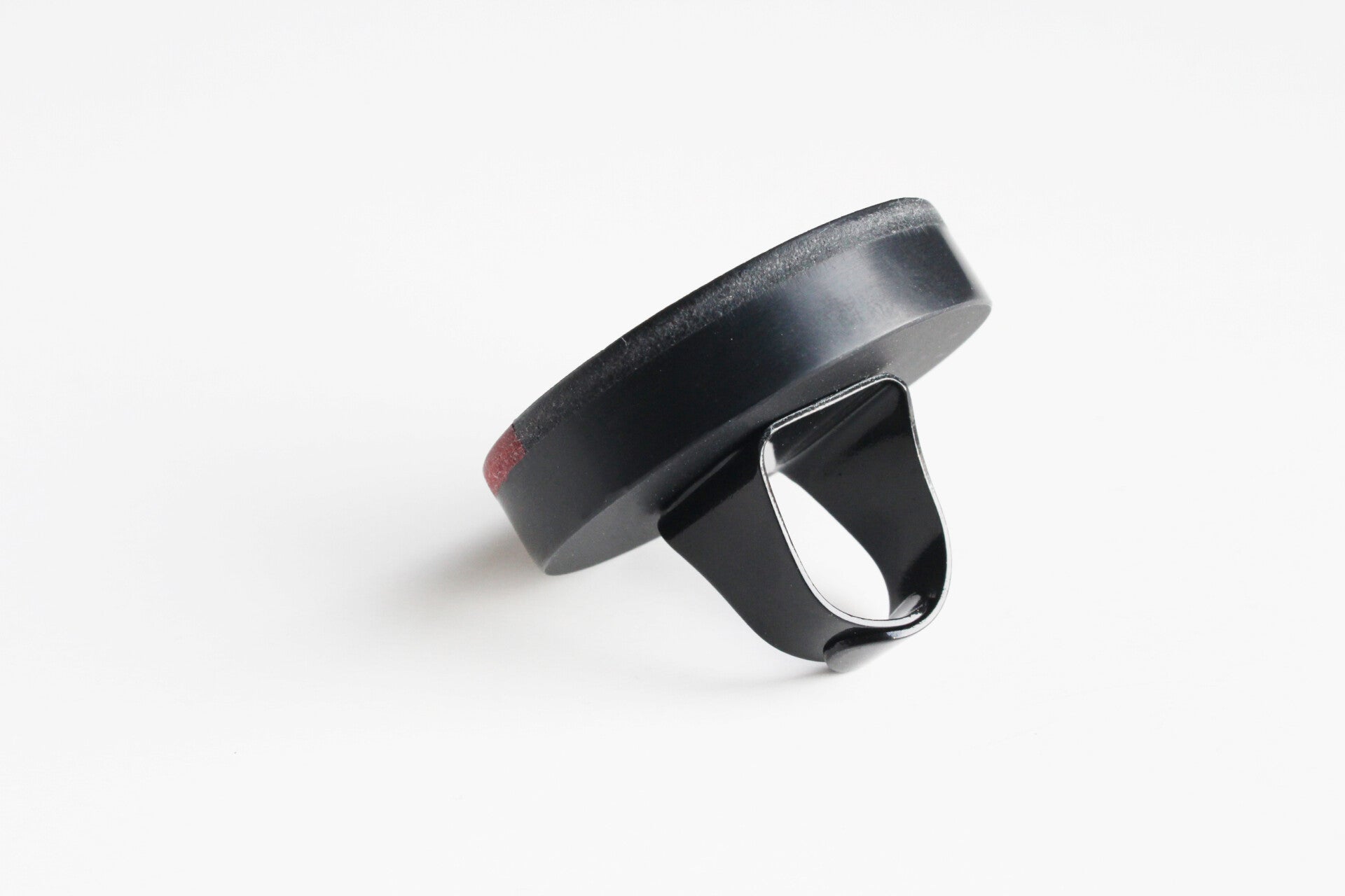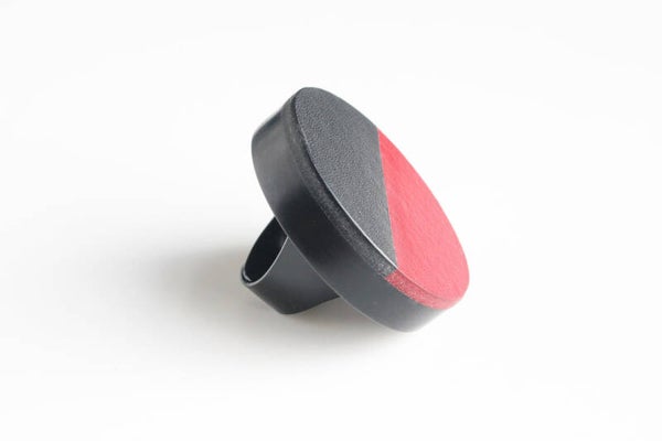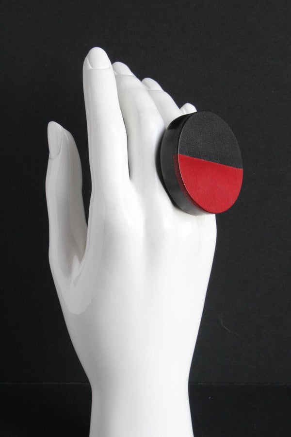 Verstelbare zwart gecoate metalen ring van zwart acrylaat gelamineerd met zwart en rood tuigleer.