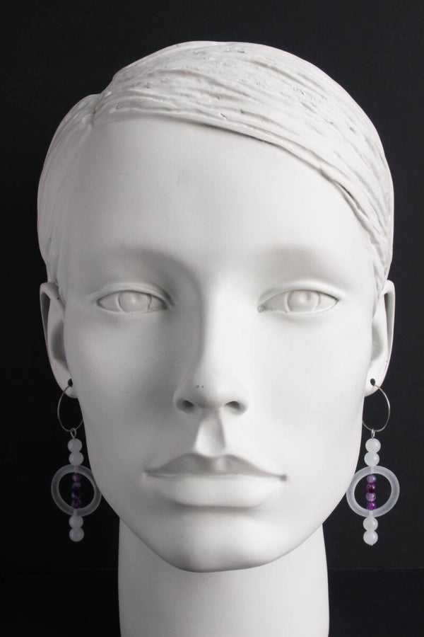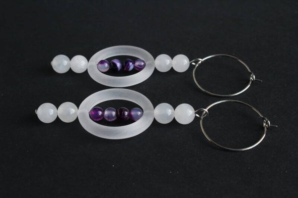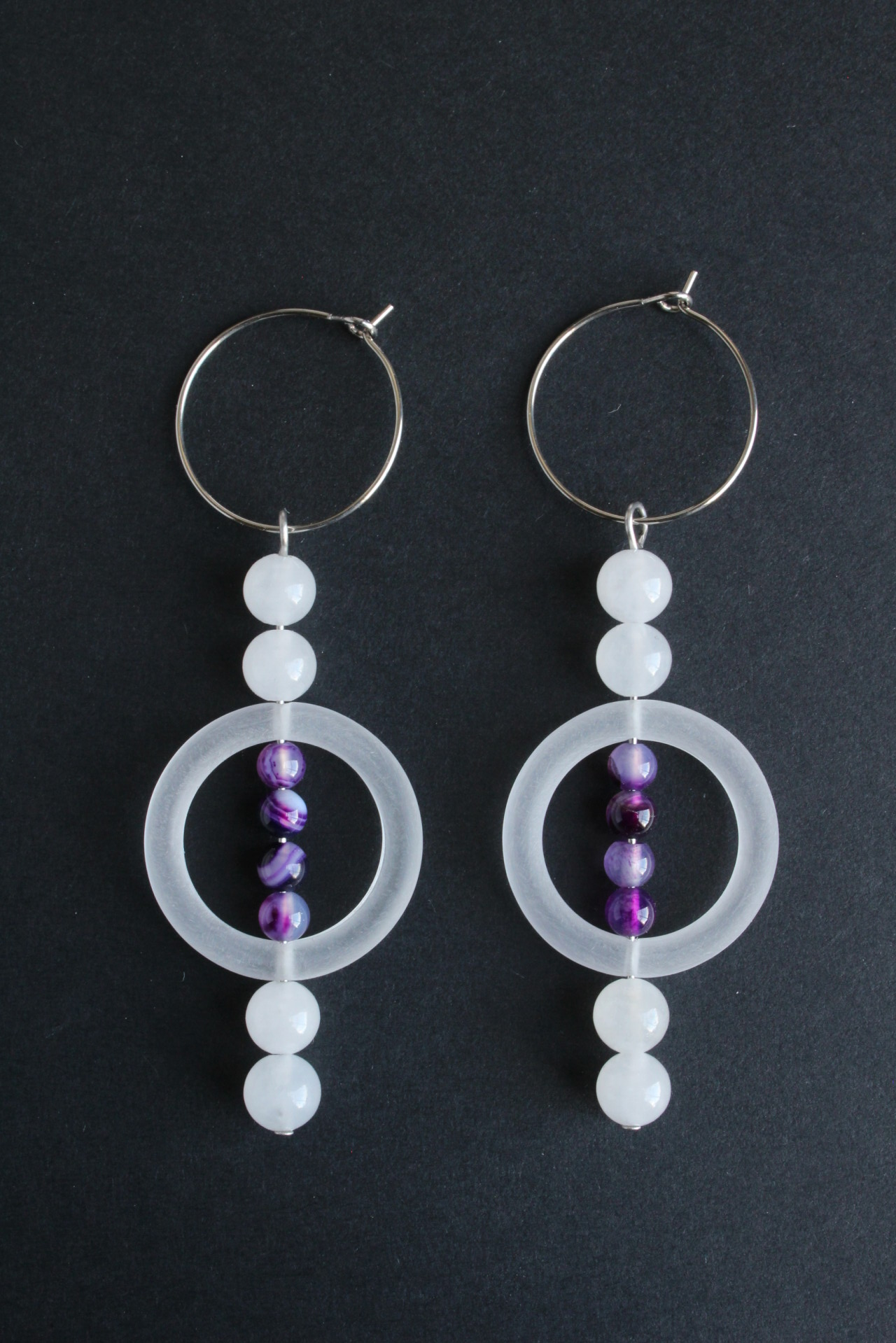 Oorbellen van opaal acrylaat en gestreept paarse agaat en witte jade aan oorringen van rvs.